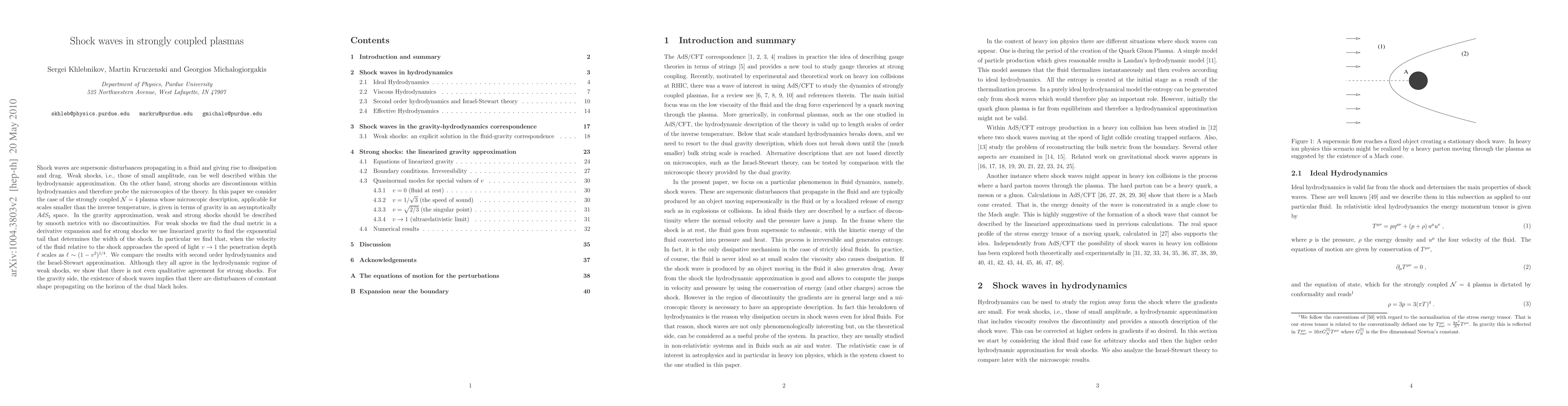 Shock waves are supersonic disturbances propagating in a fluid and giving rise to dissipation and drag. Weak shocks, i.e., those of small amplitude, can be well described within the hydrodynamic approximation. On the other hand, strong shocks are discontinuous within hydrodynamics and therefore probe the microscopics of the theory. In this paper we consider the case of the strongly coupled N=4 plasma whose microscopic description, applicable for scales smaller than the inverse temperature, is given in terms of gravity in an asymptotically $AdS_5$ space. In the gravity approximation, weak and strong shocks should be described by smooth metrics with no discontinuities. For weak shocks we find the dual metric in a derivative expansion and for strong shocks we use linearized gravity to find the exponential tail that determines the width of the shock. In particular we find that, when the velocity of the fluid relative to the shock approaches the speed of light $v\to 1$ the penetration depth $\ell$ scales as $\ell\sim (1-v^2)^{1/4}$. We compare the results with second order hydrodynamics and the Israel-Stewart approximation. Although they all agree in the hydrodynamic regime of weak shocks, we show that there is not even qualitative agreement for strong shocks. For the gravity side, the existence of shock waves implies that there are disturbances of constant shape propagating on the horizon of the dual black holes.