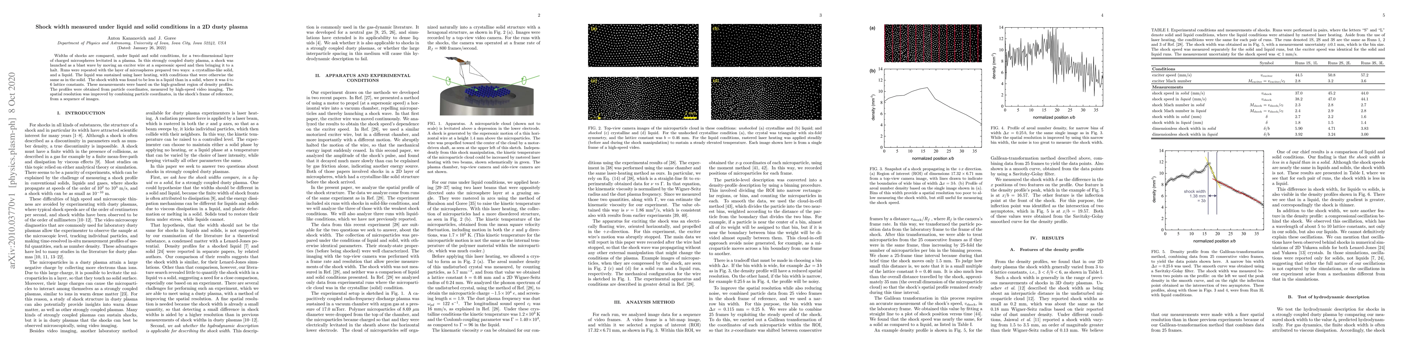 This study compares shock widths in a 2D dusty plasma under liquid and solid conditions, finding that shocks are narrower in the liquid state. High-speed video imaging and particle coordinate analysis revealed the shock width to be 4 to 6 lattice constants smaller in a liquid compared to a solid.