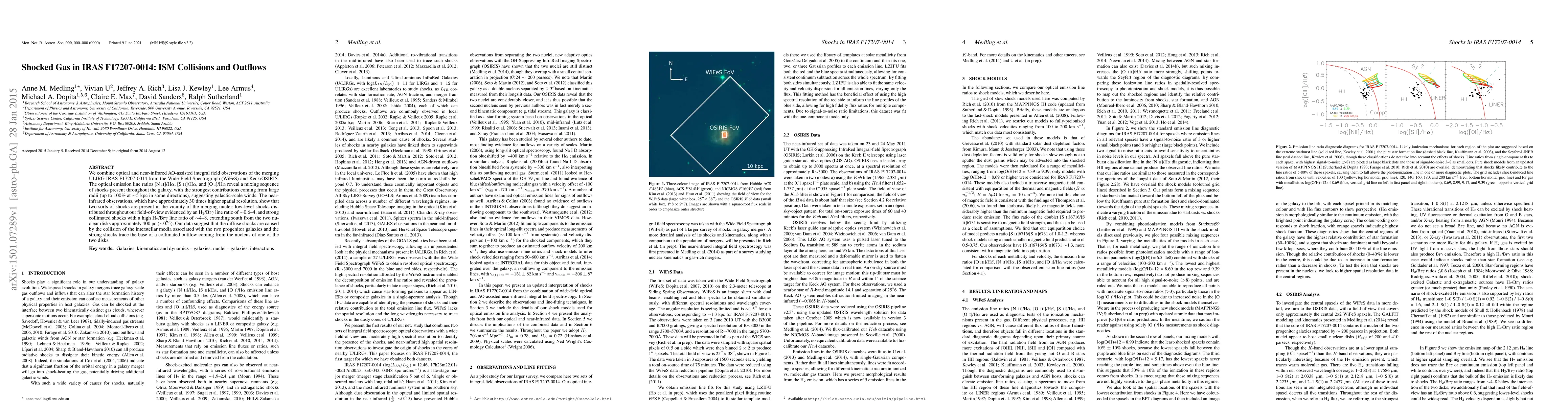 We combine optical and near-infrared AO-assisted integral field observations of the merging ULIRG IRAS F17207-0014 from the Wide-Field Spectrograph (WiFeS) and Keck/OSIRIS. The optical emission line ratios [N II]/H$\alpha$, [S II]/H$\alpha$, and [O I]/H$\alpha$ reveal a mixing sequence of shocks present throughout the galaxy, with the strongest contributions coming from large radii (up to 100% at $\sim$5 kpc in some directions), suggesting galactic-scale winds. The near-infrared observations, which have approximately 30 times higher spatial resolution, show that two sorts of shocks are present in the vicinity of the merging nuclei: low-level shocks distributed throughout our field-of-view evidenced by an H$_{2}$/Br$\gamma$ line ratio of $\sim$0.6-4, and strong collimated shocks with a high H$_{2}$/Br$\gamma$ line ratio of $\sim$4-8, extending south from the two nuclear disks approximately 400 pc ($\sim$0.5 arcsec). Our data suggest that the diffuse shocks are caused by the collision of the interstellar media associated with the two progenitor galaxies and the strong shocks trace the base of a collimated outflow coming from the nucleus of one of the two disks.