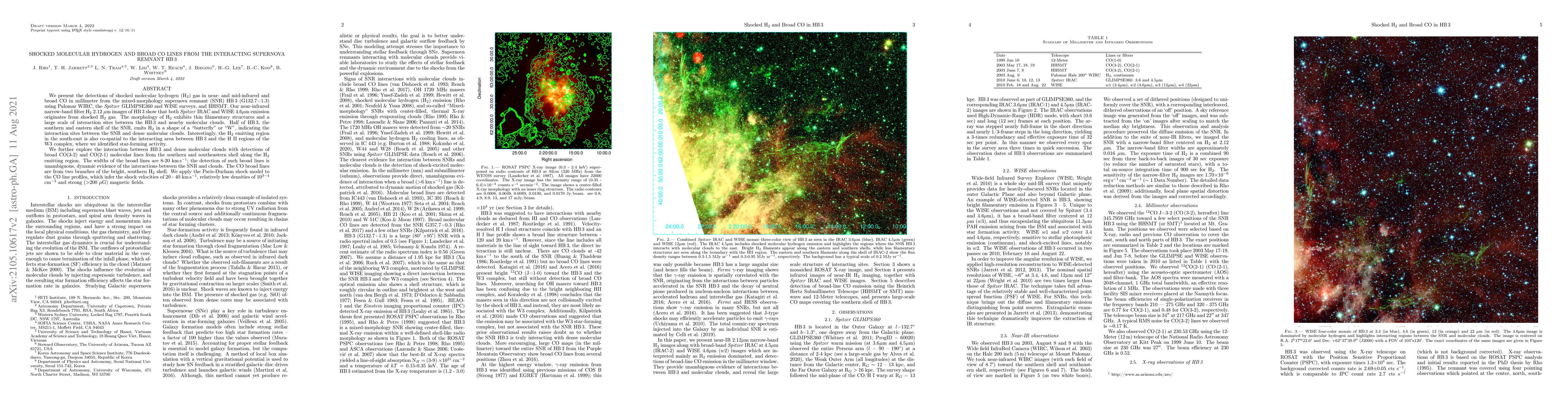 This paper reports the detection of shocked molecular hydrogen (H2) and broad CO lines in the supernova remnant HB 3, indicating dynamic interactions with nearby molecular clouds. The H2 emission forms filamentary structures and a "butterfly" shape, suggesting significant interaction with dense molecular clouds and H II regions, while broad CO lines reveal shock velocities of 20-40 km/s and strong magnetic fields.