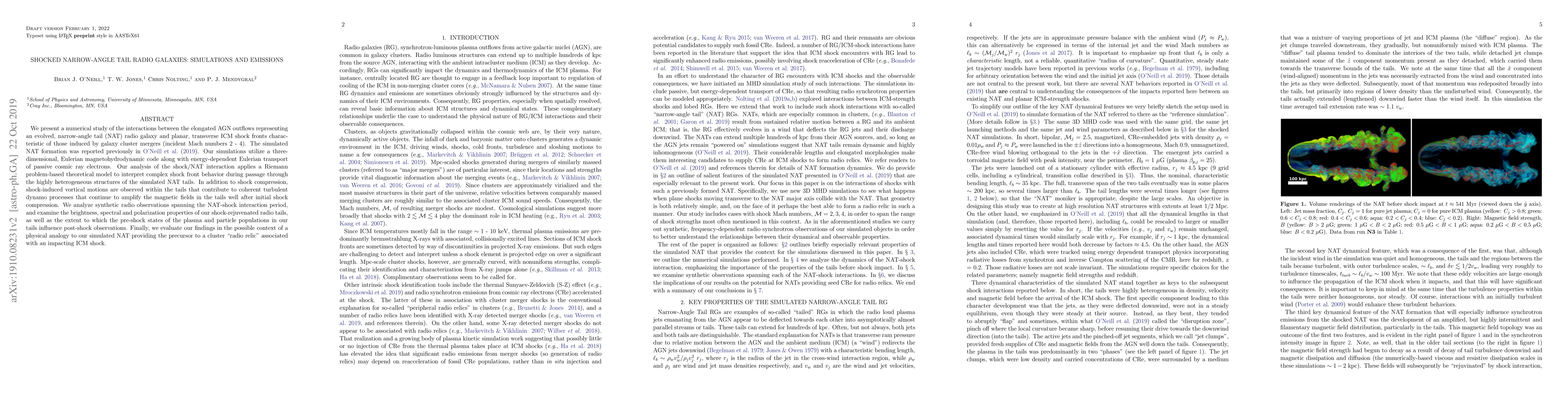 This study simulates the interaction between narrow-angle tail radio galaxies and galaxy cluster merger-induced shock fronts using magnetohydrodynamics. It finds that shock-induced vortical motions within the tails amplify magnetic fields, rejuvenating radio emissions. The research analyzes synthetic radio observations to understand brightness, spectral, and polarization properties of these shock-rejuvenated tails, suggesting a possible link to cluster 'radio relics'.