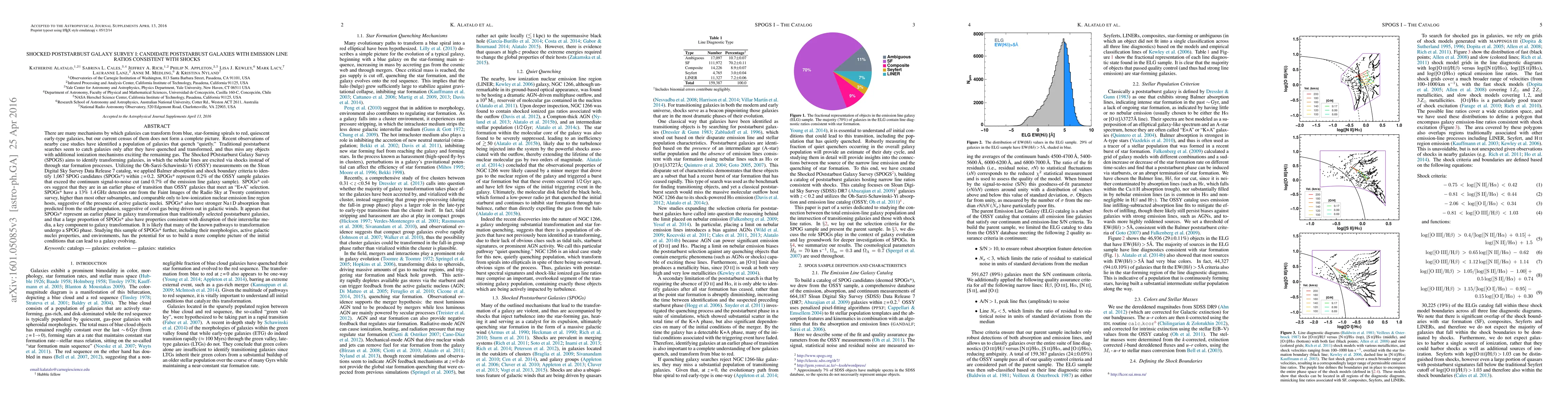 The Shocked POststarburst Galaxy Survey (SPOGS) identifies galaxies where nebular lines are excited by shocks rather than star formation, using OSSY measurements. The study finds 1,067 candidate SPOGs within z=0.2, suggesting these galaxies are in an earlier transition phase than typical poststarburst galaxies, with evidence of active galactic nuclei and disrupted interstellar media.