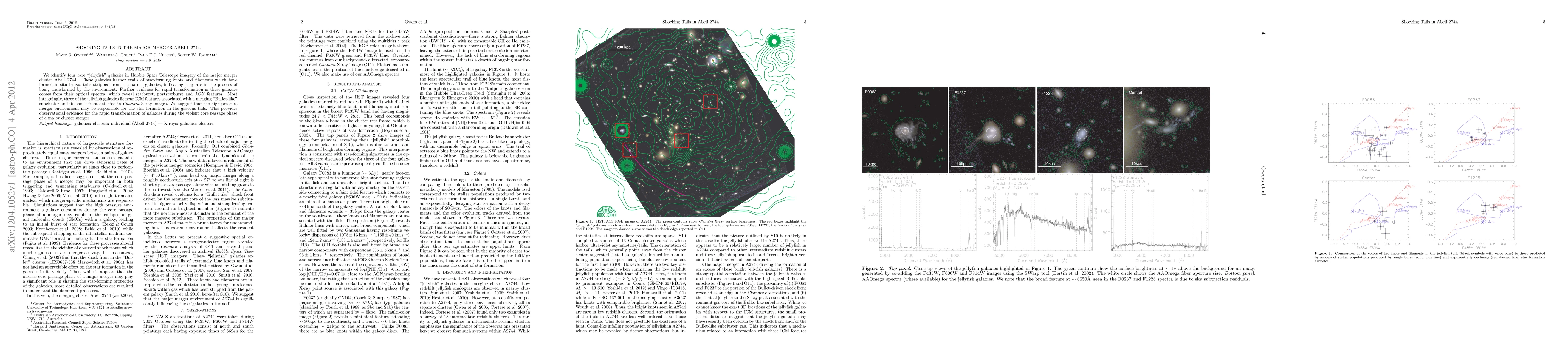 This study identifies four "jellyfish" galaxies in the Abell 2744 cluster, showing star-forming filaments stripped from their bodies, indicating environmental transformation. The galaxies exhibit starburst, poststarburst, and AGN features, suggesting rapid changes, with three located near a merging subcluster's shock front, hinting at the merger environment's role in their star formation.