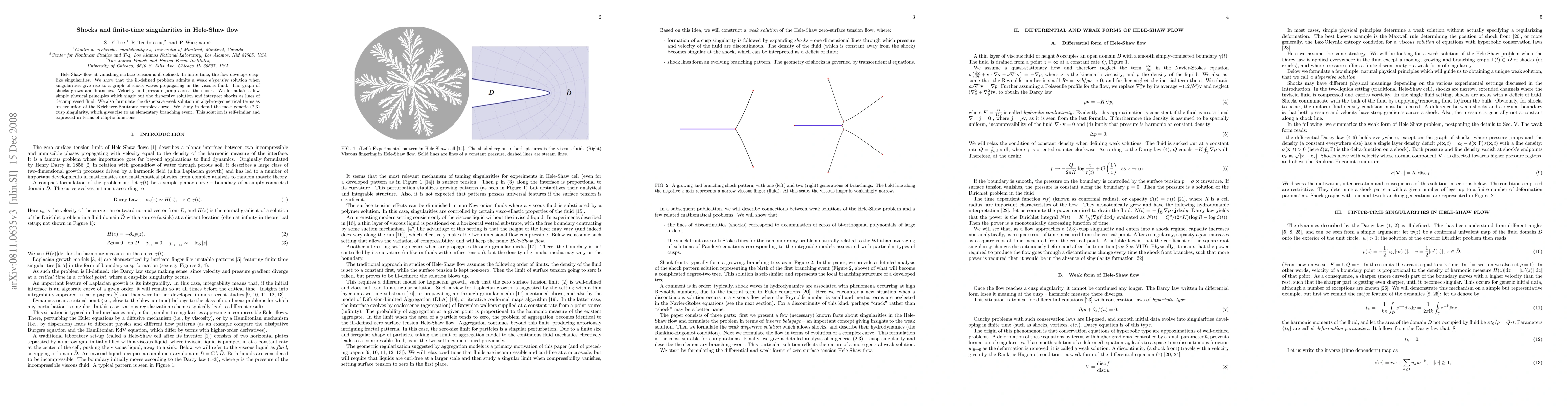 Hele-Shaw flow at vanishing surface tension is ill-defined. In finite time, the flow develops cusp-like singularities. We show that the ill-defined problem admits a weak {\it dispersive} solution when singularities give rise to a graph of shock waves propagating in the viscous fluid. The graph of shocks grows and branches. Velocity and pressure jump across the shock. We formulate a few simple physical principles which single out the dispersive solution and interpret shocks as lines of decompressed fluid. We also formulate the dispersive weak solution in algebro-geometrical terms as an evolution of the Krichever-Boutroux complex curve. We study in detail the most generic (2,3) cusp singularity, which gives rise to an elementary branching event. This solution is self-similar and expressed in terms of elliptic functions.