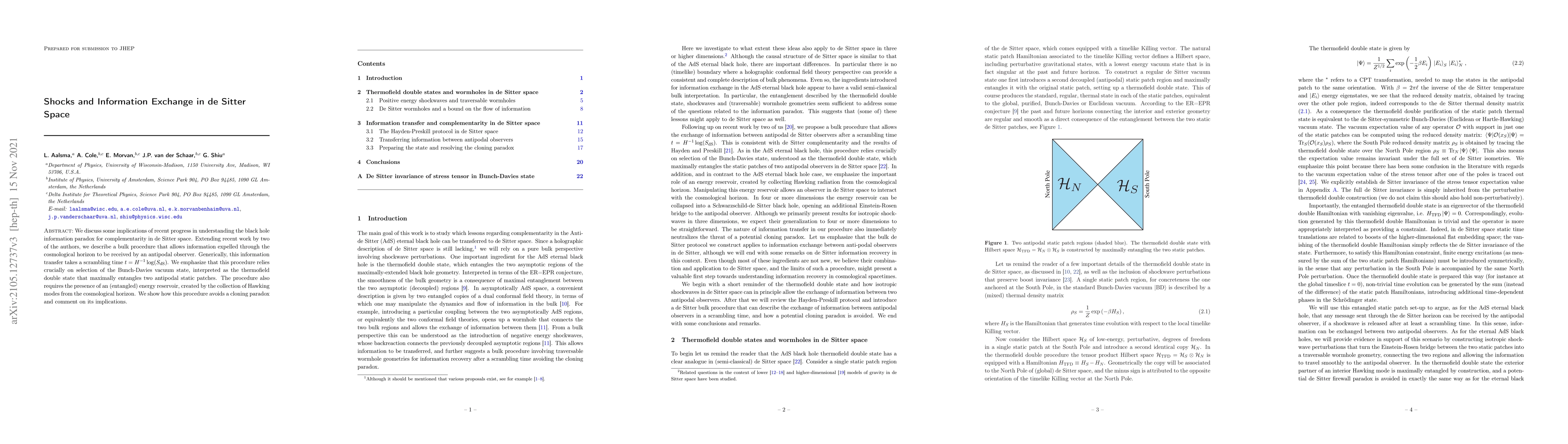 We discuss some implications of recent progress in understanding the black hole information paradox for complementarity in de Sitter space. Extending recent work by two of the authors, we describe a bulk procedure that allows information expelled through the cosmological horizon to be received by an antipodal observer. Generically, this information transfer takes a scrambling time $t = H^{-1}\log(S_{\rm dS})$. We emphasize that this procedure relies crucially on selection of the Bunch-Davies vacuum state, interpreted as the thermofield double state that maximally entangles two antipodal static patches. The procedure also requires the presence of an (entangled) energy reservoir, created by the collection of Hawking modes from the cosmological horizon. We show how this procedure avoids a cloning paradox and comment on its implications.