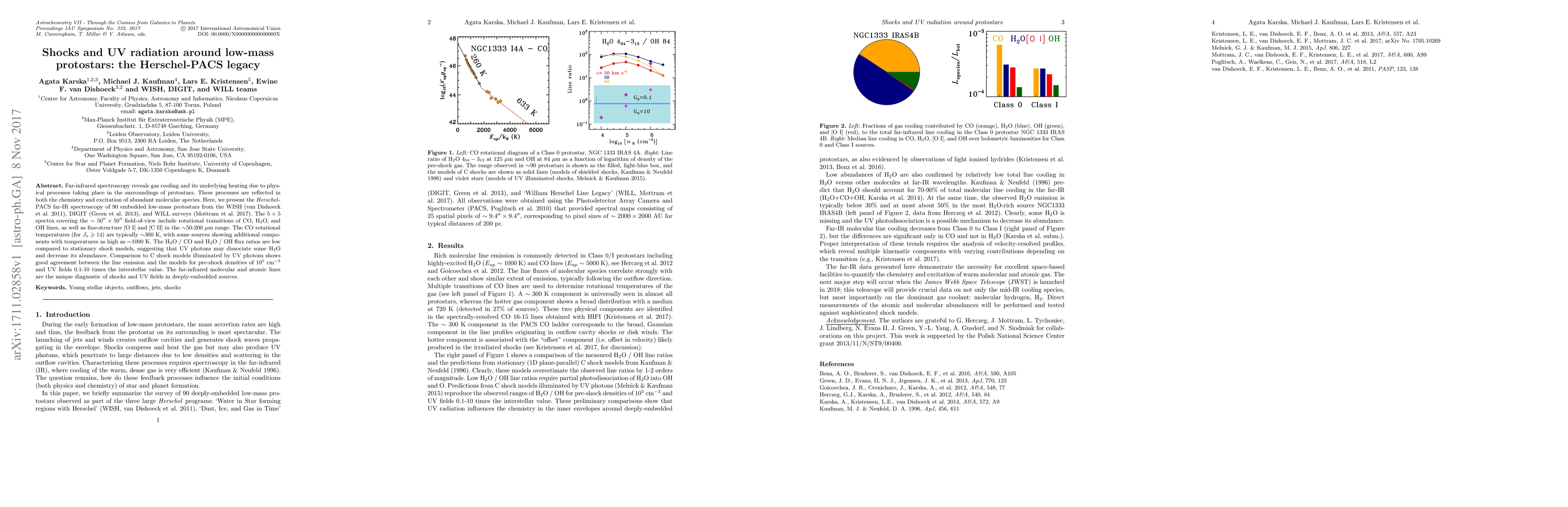 This study uses Herschel-PACS far-infrared spectroscopy to analyze gas cooling and heating around 90 low-mass protostars, revealing complex chemistry and excitation patterns. The findings suggest that UV radiation impacts molecular species, particularly H$_2$O, and that far-infrared lines provide a unique diagnostic for shocks and UV fields in these environments.