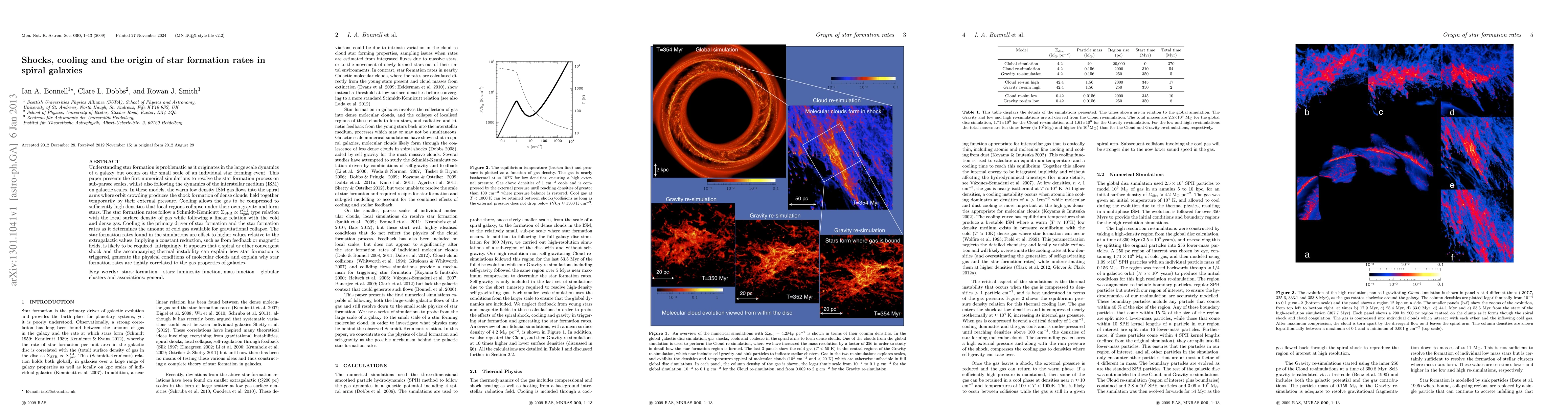 Numerical simulations show that cooling is the primary driver of star formation in spiral galaxies, with shock formation triggering dense clouds that collapse under their own gravity to form stars.