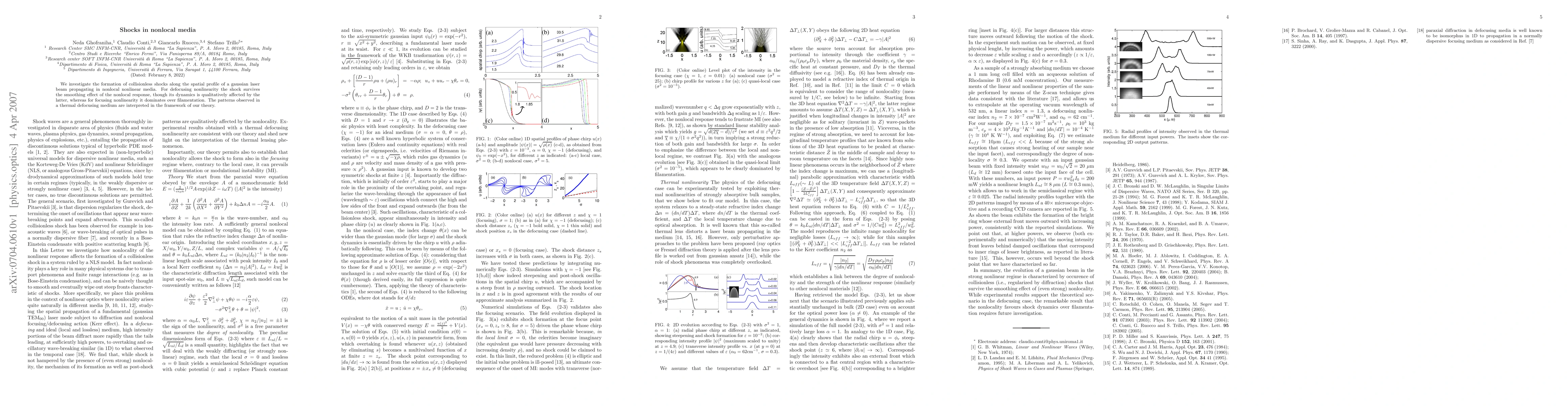 We investigate the formation of collisionless shocks along the spatial profile of a gaussian laser beam propagating in nonlocal nonlinear media. For defocusing nonlinearity the shock survives the smoothing effect of the nonlocal response, though its dynamics is qualitatively affected by the latter, whereas for focusing nonlinearity it dominates over filamentation. The patterns observed in a thermal defocusing medium are interpreted in the framework of our theory.