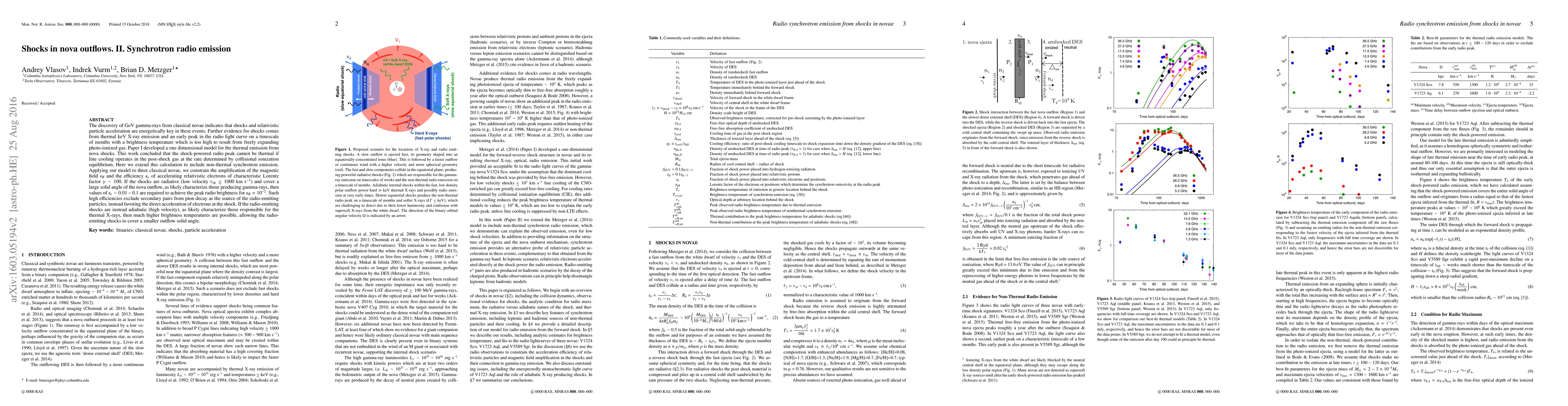This paper investigates the synchrotron radio emission from shocks in nova outflows, finding that GeV gamma-rays and thermal X-rays indicate shocks are key in novae. The model suggests high efficiencies for electron acceleration at these shocks, ruling out secondary pairs from pion decay and favoring direct acceleration, depending on whether the shocks are radiative or adiabatic.