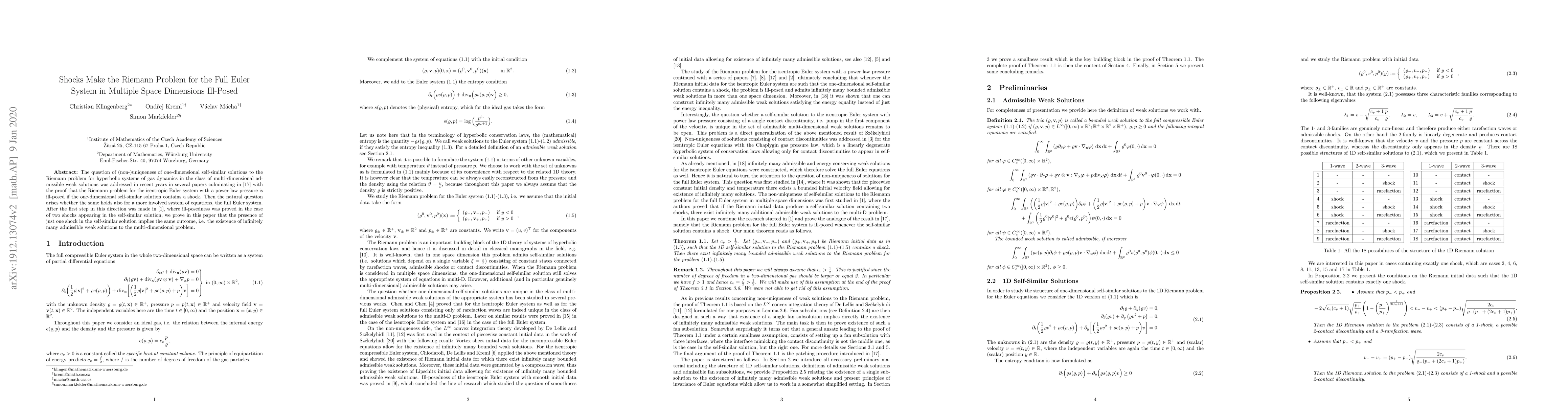 This paper proves that the Riemann problem for the full Euler system in multiple space dimensions becomes ill-posed when a single shock is present in the one-dimensional self-similar solution, leading to infinitely many admissible weak solutions. This extends previous findings on the ill-posedness of the Riemann problem with multiple shocks.