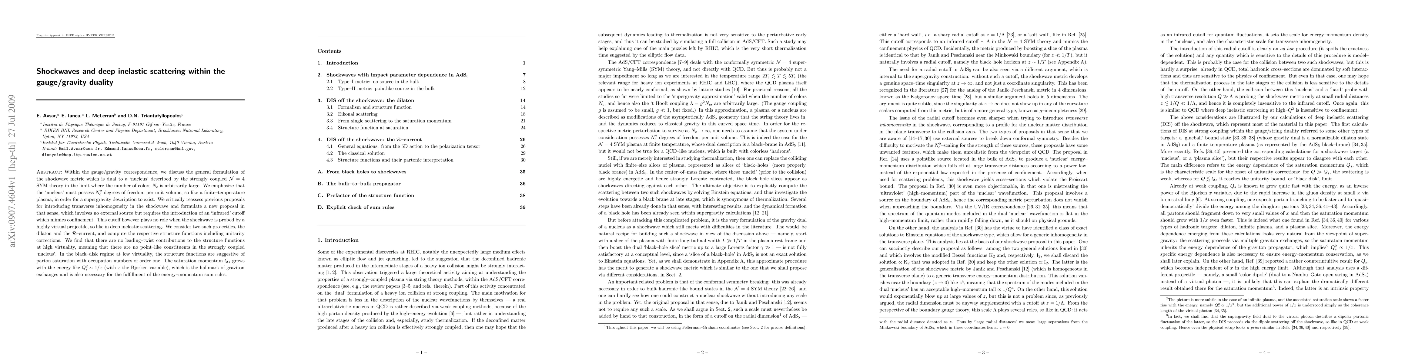 Within the gauge/gravity correspondence, we discuss the general formulation of the shockwave metric which is dual to a 'nucleus' described by the strongly-coupled N=4 SYM theory in the limit where the number of colors Nc is arbitrarily large. We emphasize that the 'nucleus' must possess Nc^2 degrees of freedom per unit volume, so like a finite-temperature plasma, in order for a supergravity description to exist. We critically reassess previous proposals for introducing transverse inhomogeneity in the shockwave and formulate a new proposal in that sense, which involves no external source but requires the introduction of an 'infrared' cutoff which mimics confinement. This cutoff however plays no role when the shockwave is probed by a highly virtual projectile, so like in deep inelastic scattering. We consider two such projectiles, the dilaton and the R-current, and compute the respective structure functions including unitarity corrections. We find that there are no leading-twist contributions to the structure functions at high virtuality, meaning that there are no point-like constituents in the strongly coupled 'nucleus'. In the black-disk regime at low virtuality, the structure functions are suggestive of parton saturation with occupation numbers of order one. The saturation momentum Qs grows with the energy like Qs^2 ~ 1/x (with x the Bjorken variable), which is the hallmark of graviton exchanges and is also necessary for the fulfillment of the energy-momentum sum rules.