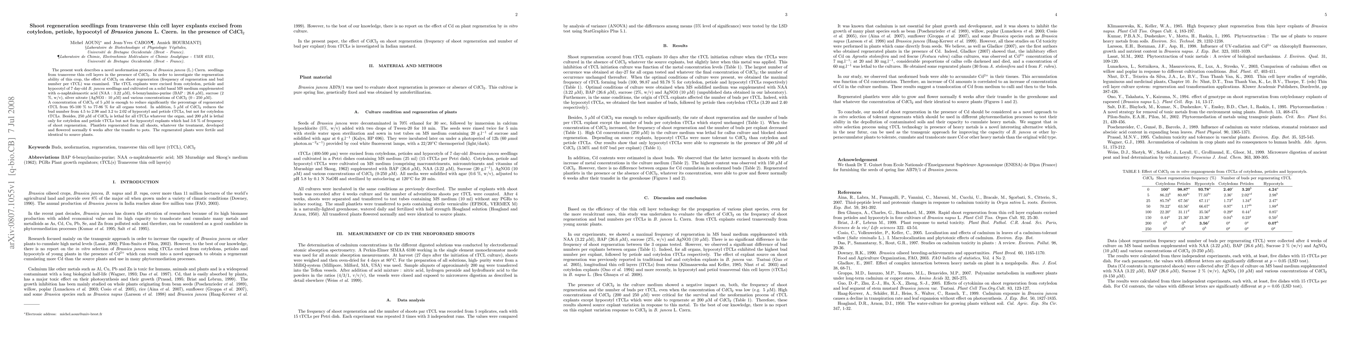 Researchers successfully regenerates shoots from thin cell layer explants of Brassica juncea in the presence of cadmium chloride, with varying effects on regeneration frequency and bud number at different concentrations.
