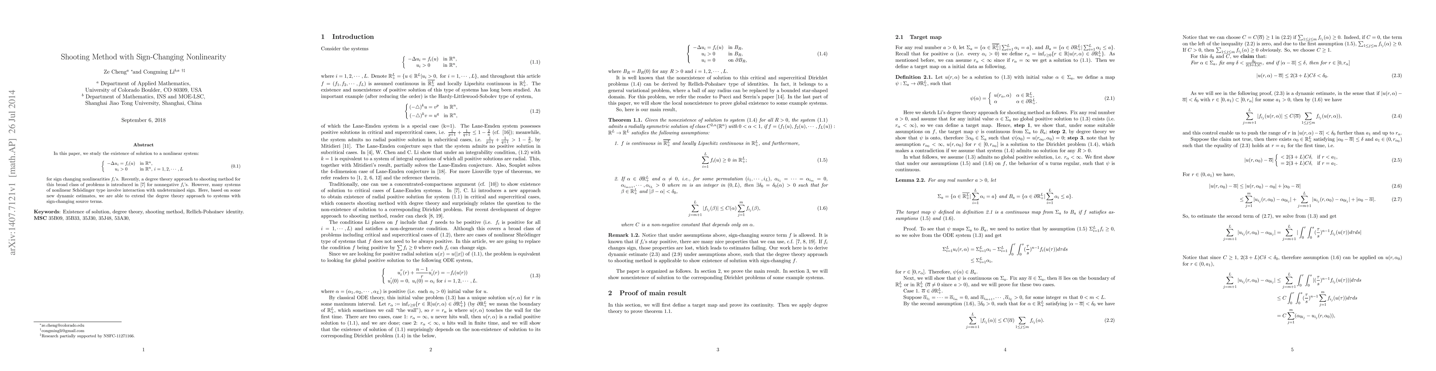 In this paper, we study the existence of solution to a nonlinear system: \begin{align} \left\{\begin{array}{cl} -\Delta u_{i} = f_{i}(u) & \text{in } \mathbb{R}^n, u_{i} > 0 & \text{in } \mathbb{R}^n, \, i = 1, 2,\cdots, L % u_{i}(x) \rightarrow 0 & \text{uniformly as } |x| \rightarrow \infty \end{array} \right. \end{align} for sign changing nonlinearities $f_i$'s. Recently, a degree theory approach to shooting method for this broad class of problems is introduced in \cite{LiarXiv13} for nonnegative $f_i$'s. However, many systems of nonlinear Sch\"odinger type involve interaction with undetermined sign. Here, based on some new dynamic estimates, we are able to extend the degree theory approach to systems with sign-changing source terms.