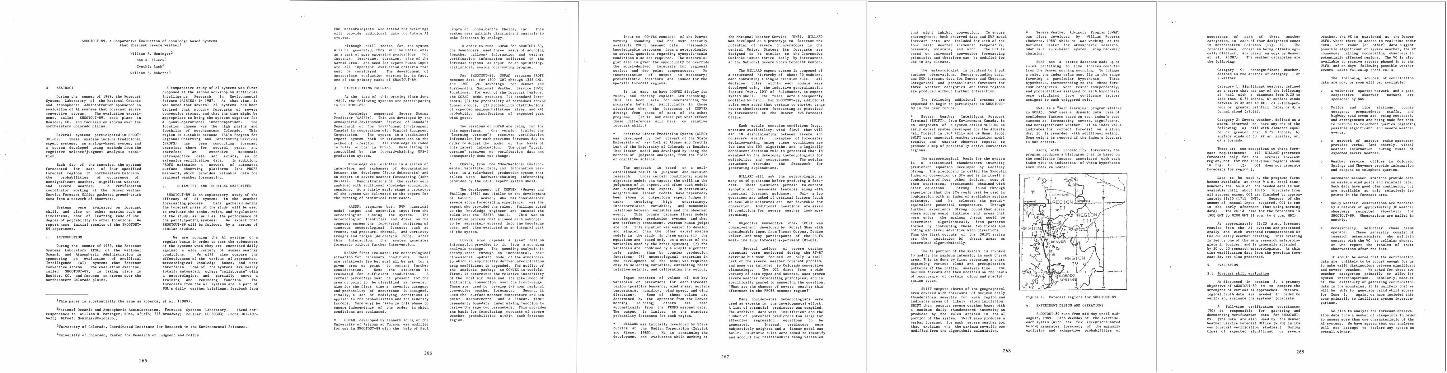 During the summer of 1989, the Forecast Systems Laboratory of the National Oceanic and Atmospheric Administration sponsored an evaluation of artificial intelligence-based systems that forecast severe convective storms. The evaluation experiment, called Shootout-89, took place in Boulder, and focussed on storms over the northeastern Colorado foothills and plains (Moninger, et al., 1990). Six systems participated in Shootout-89. These included traditional expert systems, an analogy-based system, and a system developed using methods from the cognitive science/judgment analysis tradition. Each day of the exercise, the systems generated 2 to 9 hour forecasts of the probabilities of occurrence of: non significant weather, significant weather, and severe weather, in each of four regions in northeastern Colorado. A verification coordinator working at the Denver Weather Service Forecast Office gathered ground-truth data from a network of observers. Systems were evaluated on the basis of several measures of forecast skill, and on other metrics such as timeliness, ease of learning, and ease of use. Systems were generally easy to operate, however the various systems required substantially different levels of meteorological expertise on the part of their users--reflecting the various operational environments for which the systems had been designed. Systems varied in their statistical behavior, but on this difficult forecast problem, the systems generally showed a skill approximately equal to that of persistence forecasts and climatological (historical frequency) forecasts. The two systems that appeared best able to discriminate significant from non significant weather events were traditional expert systems. Both of these systems required the operator to make relatively sophisticated meteorological judgments. We are unable, based on only one summer's worth of data, to determine the extent to which the greater skill of the two systems was due to the content of their knowledge bases, or to the subjective judgments of the operator. A follow-on experiment, Shootout-91, is currently being planned. Interested potential participants are encouraged to contact the author at the address above.