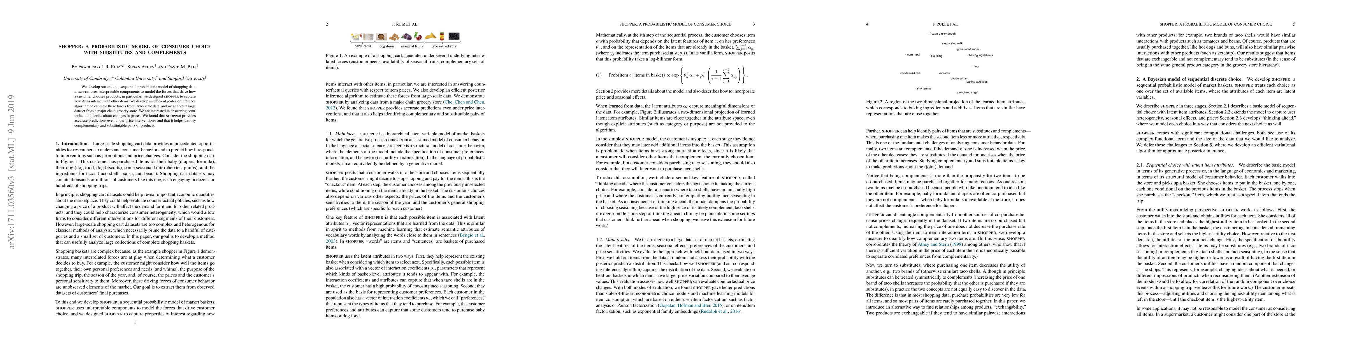 Title: SHOPPER: A Probabilistic Model of Consumer Choice with Substitutes and Complements Summary: SHOPPER is a probabilistic model designed to predict consumer choices based on interactions between items, and it accurately estimates the effects of price changes. It identifies complementary and substitutable product pairs using large-scale shopping data.