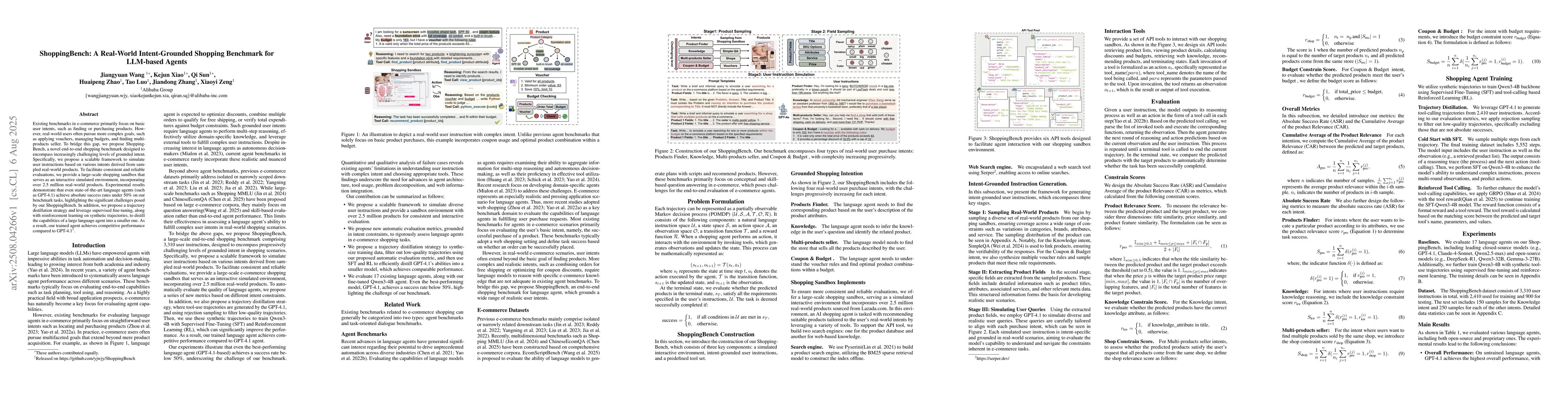 Existing benchmarks in e-commerce primarily focus on basic user intents, such as finding or purchasing products. However, real-world users often pursue more complex goals, such as applying vouchers, managing budgets, and finding multi-products seller. To bridge this gap, we propose ShoppingBench, a novel end-to-end shopping benchmark designed to encompass increasingly challenging levels of grounded intent. Specifically, we propose a scalable framework to simulate user instructions based on various intents derived from sampled real-world products. To facilitate consistent and reliable evaluations, we provide a large-scale shopping sandbox that serves as an interactive simulated environment, incorporating over 2.5 million real-world products. Experimental results demonstrate that even state-of-the-art language agents (such as GPT-4.1) achieve absolute success rates under 50% on our benchmark tasks, highlighting the significant challenges posed by our ShoppingBench. In addition, we propose a trajectory distillation strategy and leverage supervised fine-tuning, along with reinforcement learning on synthetic trajectories, to distill the capabilities of a large language agent into a smaller one. As a result, our trained agent achieves competitive performance compared to GPT-4.1.