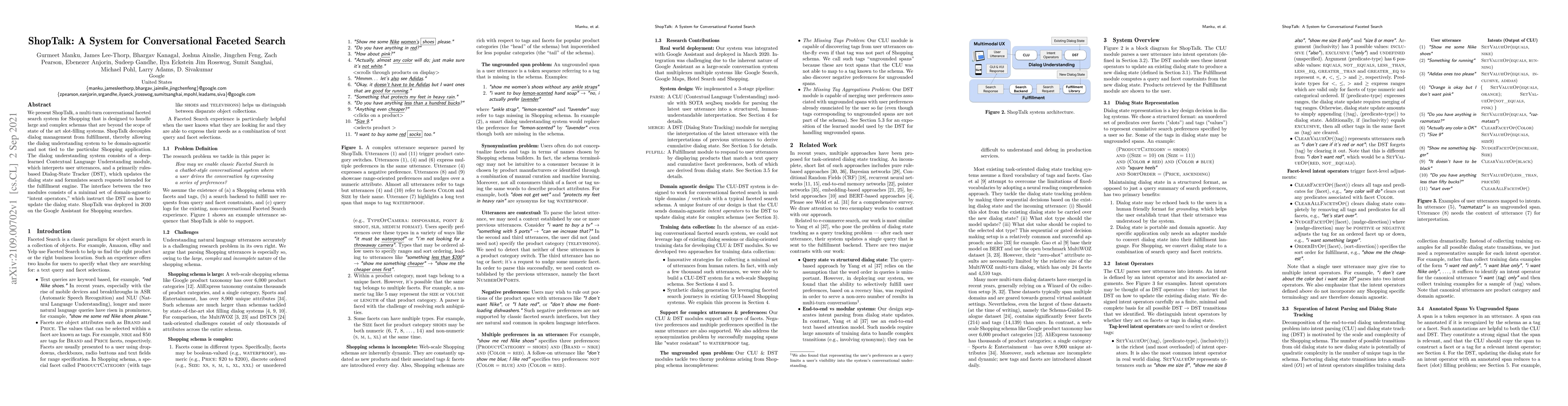 ShopTalk is a multi-turn conversational faceted search system designed for shopping, decoupling dialog management from fulfillment to allow domain-agnostic dialog understanding. It employs a deep-learned Contextual Language Understanding module and a rules-based Dialog-State Tracker, deployed on Google Assistant for Shopping searches.