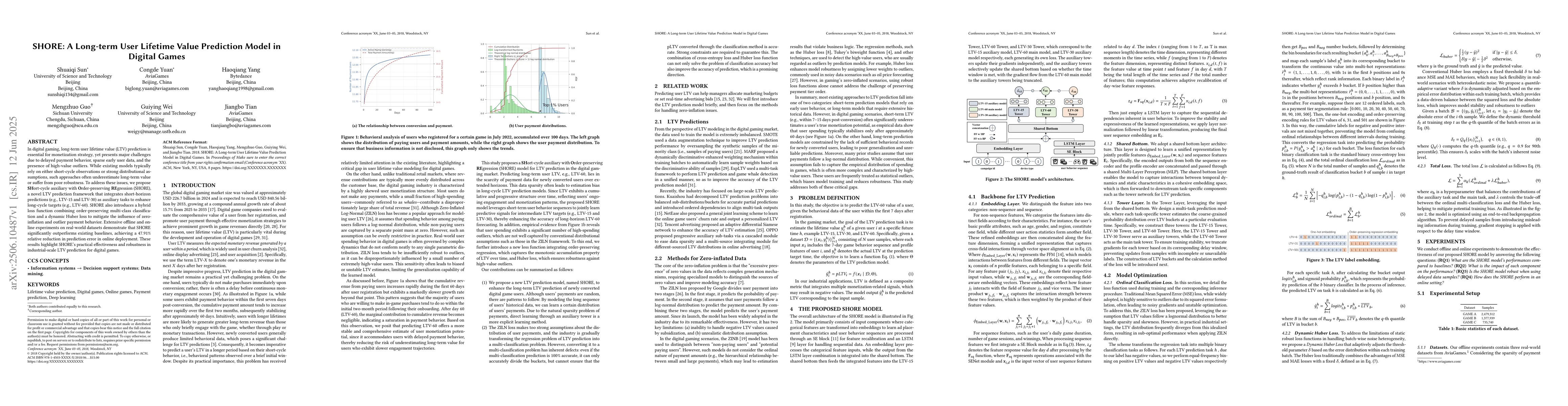 In digital gaming, long-term user lifetime value (LTV) prediction is essential for monetization strategy, yet presents major challenges due to delayed payment behavior, sparse early user data, and the presence of high-value outliers. While existing models typically rely on either short-cycle observations or strong distributional assumptions, such approaches often underestimate long-term value or suffer from poor robustness. To address these issues, we propose SHort-cycle auxiliary with Order-preserving REgression (SHORE), a novel LTV prediction framework that integrates short-horizon predictions (e.g., LTV-15 and LTV-30) as auxiliary tasks to enhance long-cycle targets (e.g., LTV-60). SHORE also introduces a hybrid loss function combining order-preserving multi-class classification and a dynamic Huber loss to mitigate the influence of zero-inflation and outlier payment behavior. Extensive offline and online experiments on real-world datasets demonstrate that SHORE significantly outperforms existing baselines, achieving a 47.91\% relative reduction in prediction error in online deployment. These results highlight SHORE's practical effectiveness and robustness in industrial-scale LTV prediction for digital games.