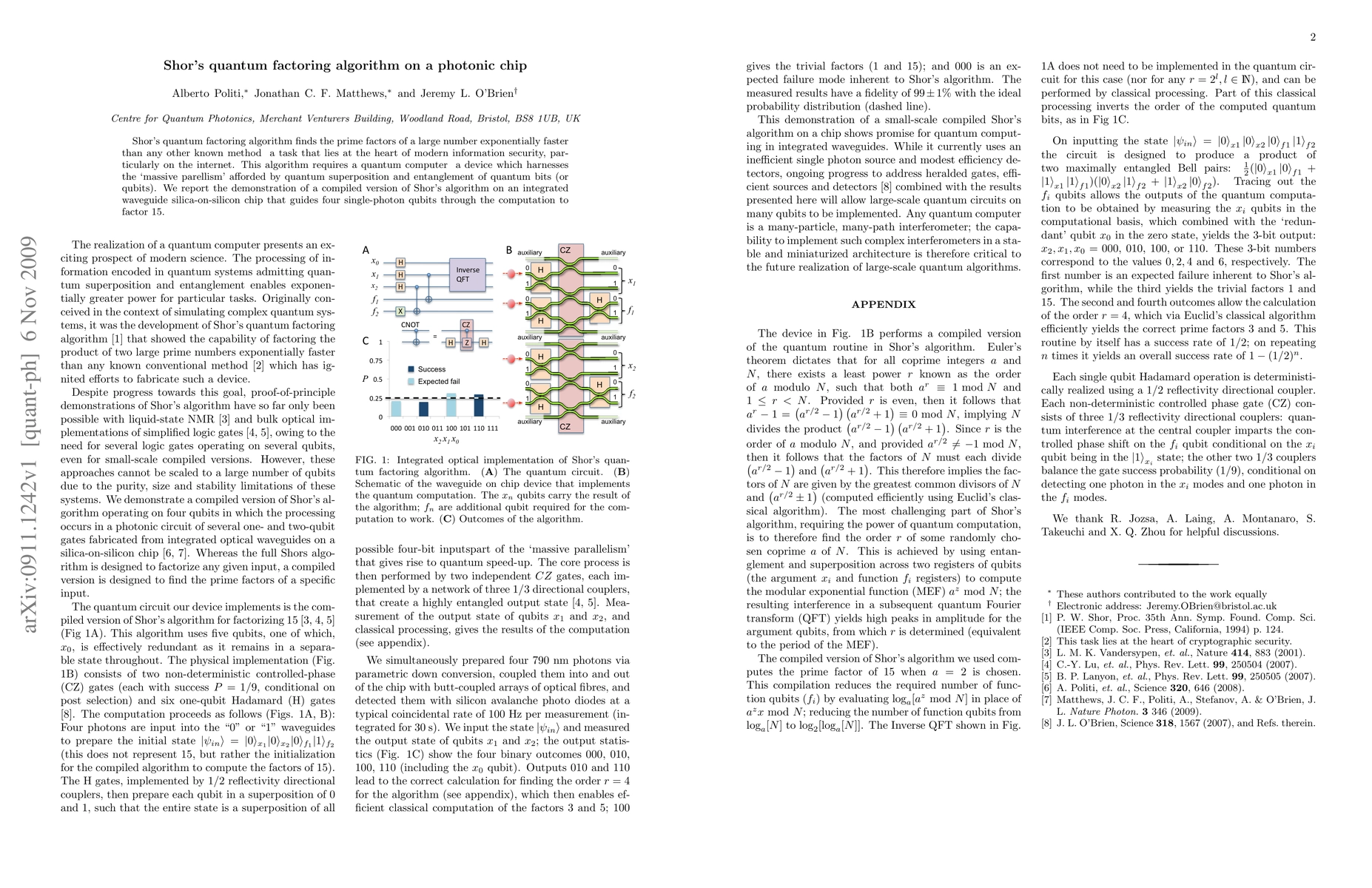 This paper demonstrates Shor's quantum factoring algorithm on a photonic chip, showcasing the use of four single-photon qubits to factor the number 15, highlighting the potential of quantum computing for exponentially faster prime factorization.