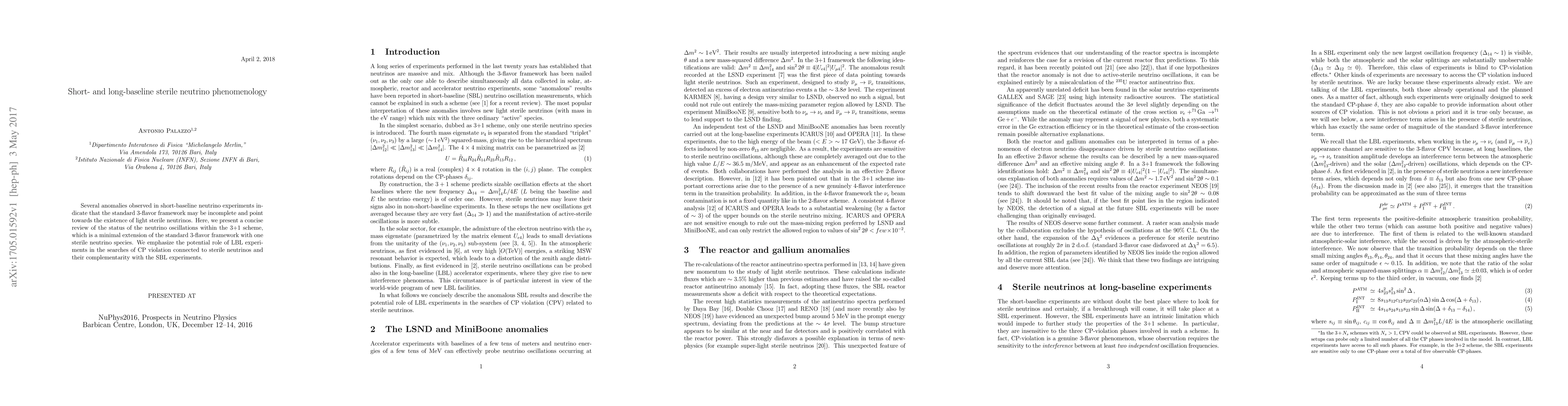 This paper reviews the evidence for light sterile neutrinos from short-baseline neutrino experiments and discusses the 3+1 neutrino oscillation model. It highlights the potential of long-baseline experiments to detect CP violation related to sterile neutrinos and their synergy with short-baseline experiments.