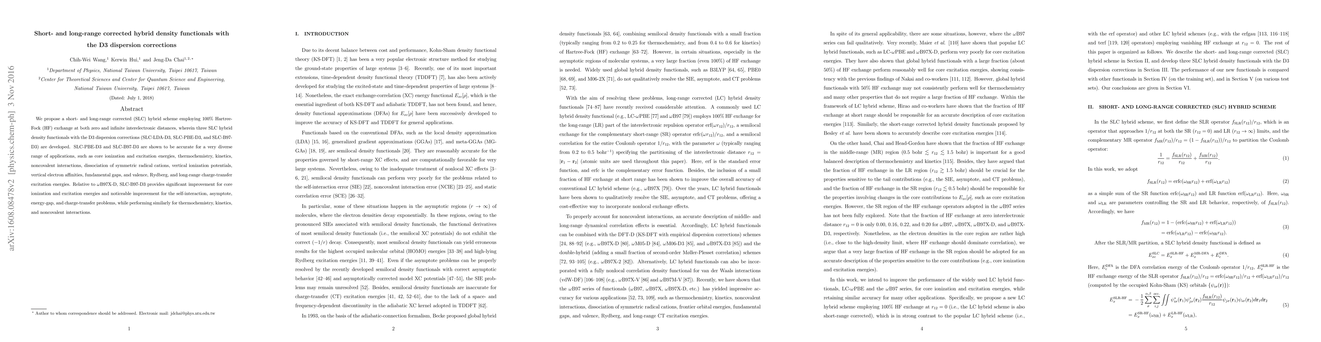 This paper introduces a short- and long-range corrected hybrid density functional theory (DFT) scheme with D3 dispersion corrections, developing three new functionals: SLC-LDA-D3, SLC-PBE-D3, and SLC-B97-D3. SLC-PBE-D3 and SLC-B97-D3 demonstrate high accuracy across various applications, including thermochemistry and noncovalent interactions, with SLC-B97-D3 showing notable improvements over existing methods in ionization and charge-transfer energies.
