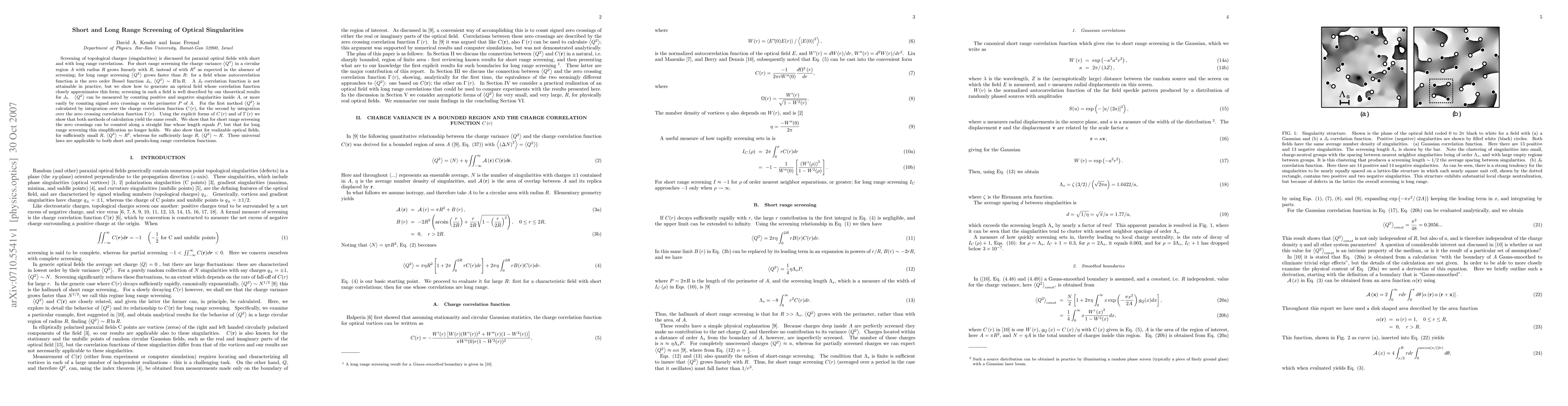 Screening of topological charges (singularities) is discussed for paraxial optical fields with short and with long range correlations. For short range screening the charge variance in a circular region with radius $R$ grows linearly with $R$, instead of with $R^{2}$ as expected in the absence of screening; for long range screening it grows faster than $R$: for a field whose autocorrelation function is the zero order Bessel function J_{0}, the charge variance grows as R ln R$. A J_{0} correlation function is not attainable in practice, but we show how to generate an optical field whose correlation function closely approximates this form. The charge variance can be measured by counting positive and negative singularities inside the region A, or more easily by counting signed zero crossings on the perimeter of A. \For the first method the charge variance is calculated by integration over the charge correlation function C(r), for the second by integration over the zero crossing correlation function Gamma(r). Using the explicit forms of C(r) and of Gamma(r) we show that both methods of calculation yield the same result. We show that for short range screening the zero crossings can be counted along a straight line whose length equals P, but that for long range screening this simplification no longer holds. We also show that for realizable optical fields, for sufficiently small R, the charge variance goes as R^2, whereas for sufficiently large R, it grows as R. These universal laws are applicable to both short and pseudo-long range correlation functions.