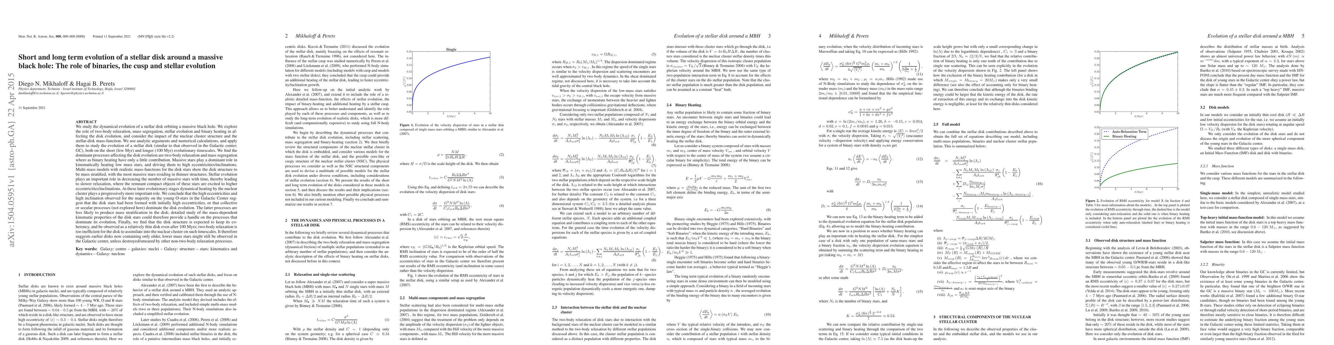 This paper investigates the evolution of a stellar disk around a massive black hole, focusing on the roles of two-body relaxation, mass segregation, binary heating, and stellar evolution. The study finds that two-body relaxation and mass segregation are the dominant forces shaping the disk, while binary heating has a minor effect. The disk maintains a thin structure over 100 Myrs, suggesting older, lower-mass stars could still be observed in the Galactic Center.
