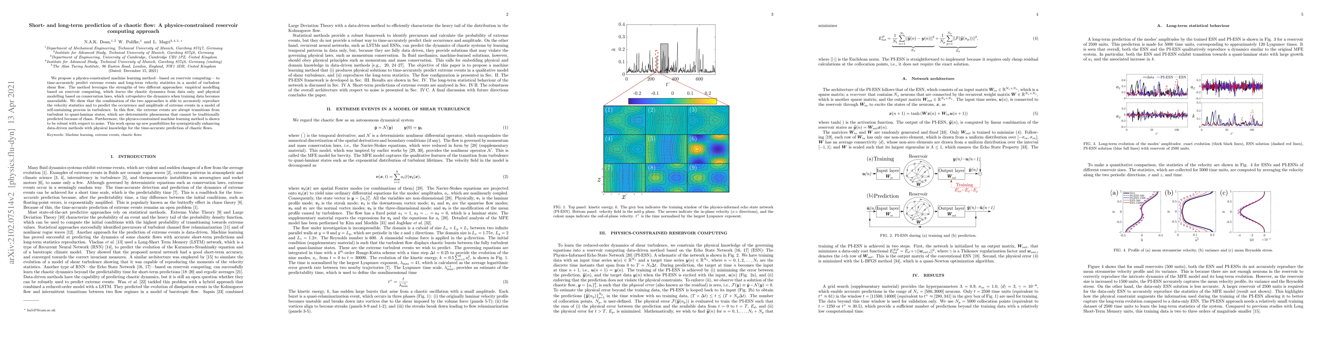 We propose a physics-constrained machine learning method-based on reservoir computing- to time-accurately predict extreme events and long-term velocity statistics in a model of turbulent shear flow. The method leverages the strengths of two different approaches: empirical modelling based on reservoir computing, which it learns the chaotic dynamics from data only, and physical modelling based on conservation laws, which extrapolates the dynamics when training data becomes unavailable. We show that the combination of the two approaches is able to accurately reproduce the velocity statistics and to predict the occurrence and amplitude of extreme events in a model of self-sustaining process in turbulence. In this flow, the extreme events are abrupt transitions from turbulent to quasi-laminar states, which are deterministic phenomena that cannot be traditionally predicted because of chaos. Furthermore, the physics-constrained machine learning method is shown to be robust with respect to noise. This work opens up new possibilities for synergistically enhancing data-driven methods with physical knowledge for the time-accurate prediction of chaotic flows.