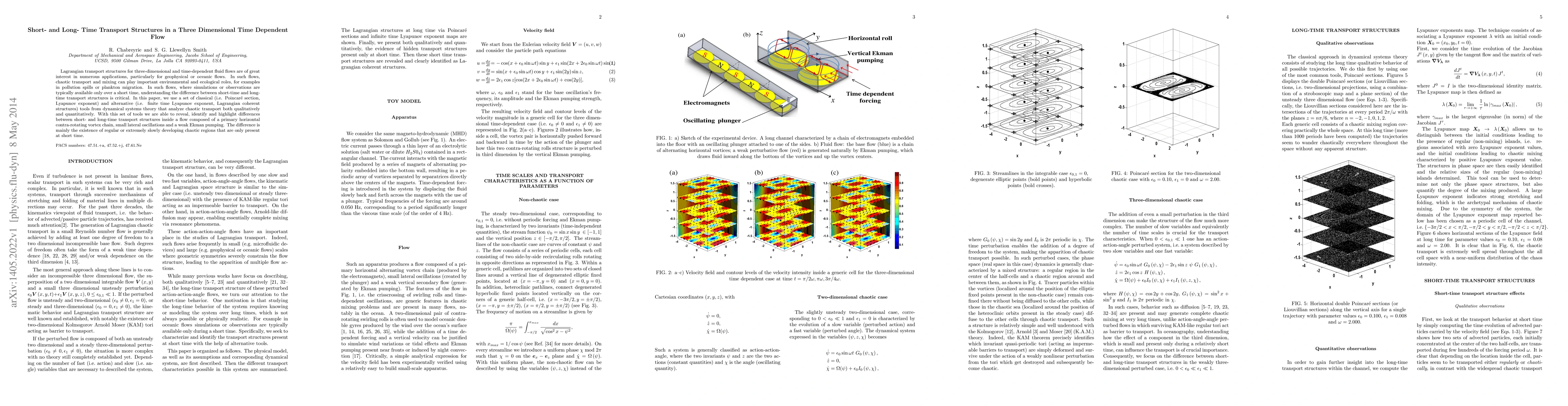 Lagrangian transport structures for three-dimensional and time-dependent fluid flows are of great interest in numerous applications, particularly for geophysical or oceanic flows. In such flows, chaotic transport and mixing can play important environmental and ecological roles, for examples in pollution spills or plankton migration. In such flows, where simulations or observations are typically available only over a short time, understanding the difference between short-time and long-time transport structures is critical. In this paper, we use a set of classical (i.e. Poincar\'e section, Lyapunov exponent) and alternative (i.e. finite time Lyapunov exponent, Lagrangian coherent structures) tools from dynamical systems theory that analyze chaotic transport both qualitatively and quantitatively. With this set of tools we are able to reveal, identify and highlight differences between short- and long-time transport structures inside a flow composed of a primary horizontal contra-rotating vortex chain, small lateral oscillations and a weak Ekman pumping. The difference is mainly the existence of regular or extremely slowly developing chaotic regions that are only present at short time.