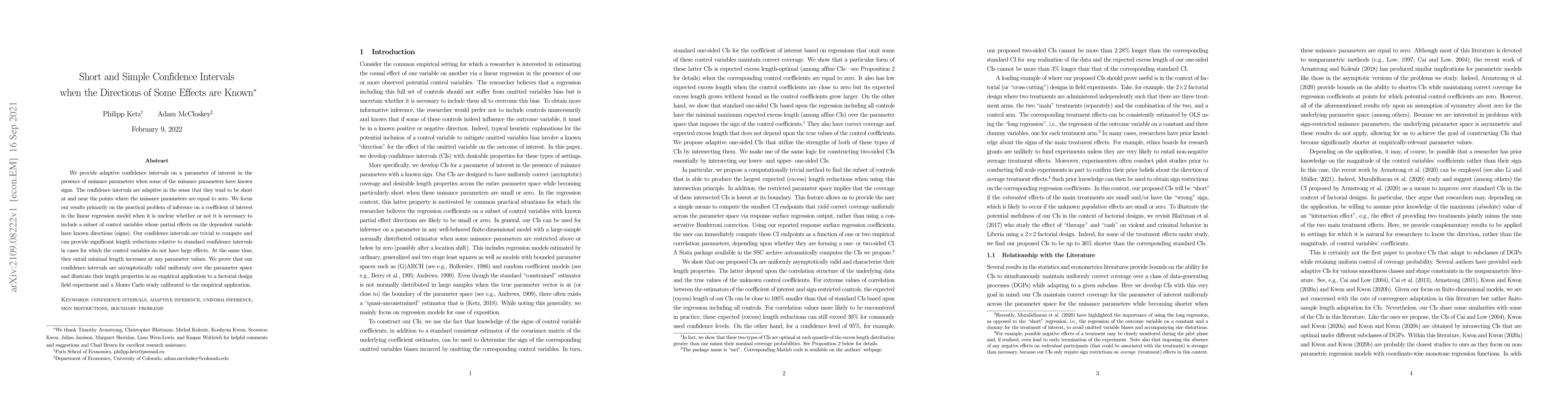 We provide adaptive confidence intervals on a parameter of interest in the presence of nuisance parameters when some of the nuisance parameters have known signs. The confidence intervals are adaptive in the sense that they tend to be short at and near the points where the nuisance parameters are equal to zero. We focus our results primarily on the practical problem of inference on a coefficient of interest in the linear regression model when it is unclear whether or not it is necessary to include a subset of control variables whose partial effects on the dependent variable have known directions (signs). Our confidence intervals are trivial to compute and can provide significant length reductions relative to standard confidence intervals in cases for which the control variables do not have large effects. At the same time, they entail minimal length increases at any parameter values. We prove that our confidence intervals are asymptotically valid uniformly over the parameter space and illustrate their length properties in an empirical application to a factorial design field experiment and a Monte Carlo study calibrated to the empirical application.