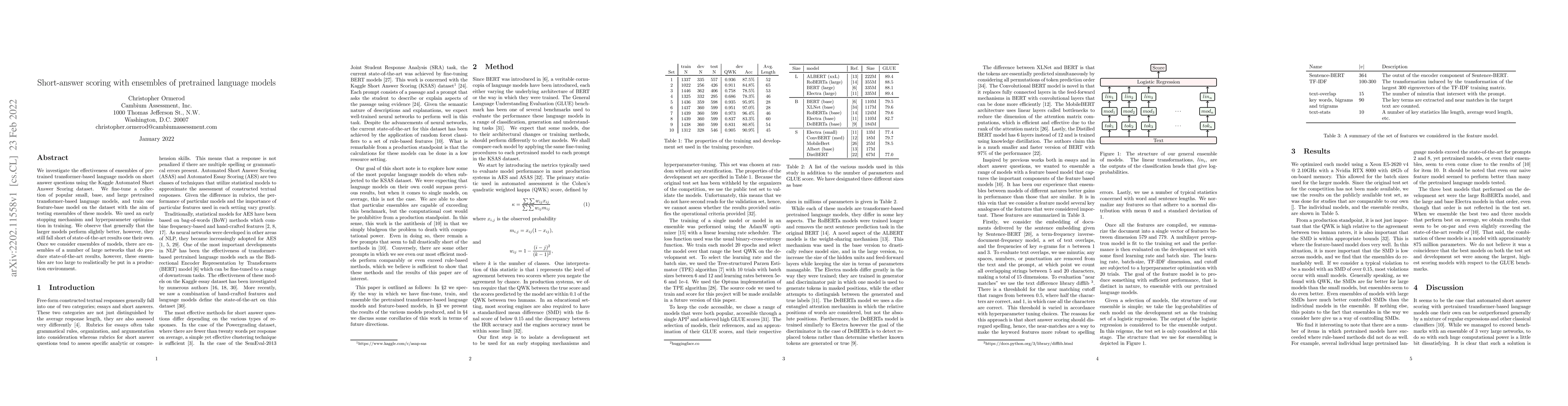 The paper investigates the effectiveness of ensembles of pretrained transformer-based language models on short answer questions using the Kaggle Automated Short Answer Scoring dataset. It fine-tunes a collection of popular small, base, and large pretrained transformer-based language models and trains a feature-based model to test ensembles.