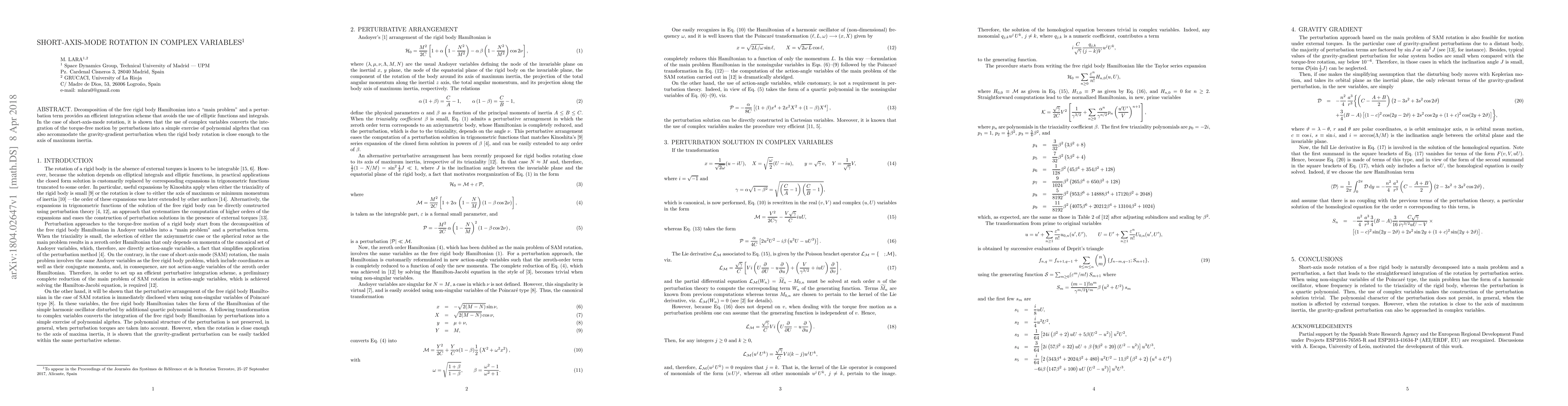 Decomposition of the free rigid body Hamiltonian into a "main problem" and a perturbation term provides an efficient integration scheme that avoids the use of elliptic functions and integrals. In the case of short-axis-mode rotation, it is shown that the use of complex variables converts the integration of the torque-free motion by perturbations into a simple exercise of polynomial algebra that can also accommodate the gravity-gradient perturbation when the rigid body rotation is close enough to the axis of maximum inertia.
