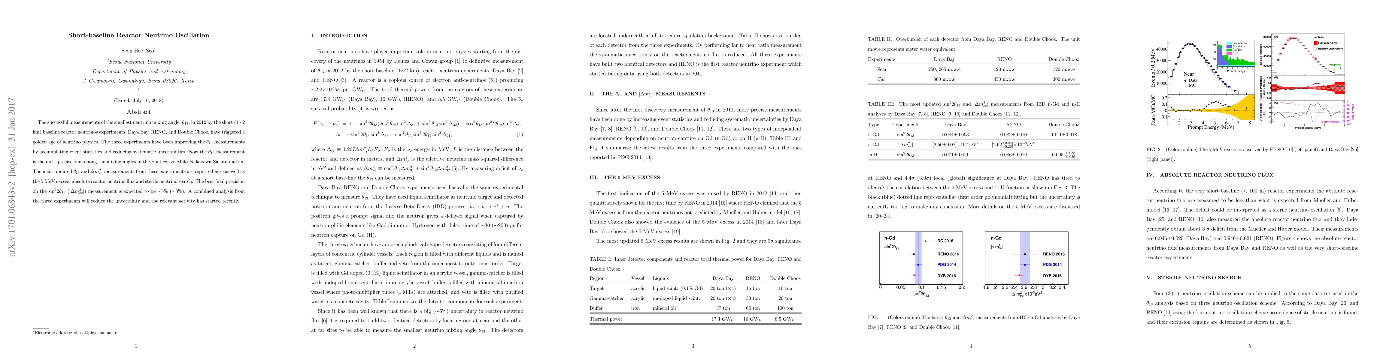 The successful measurements of the smallest neutrino mixing angle, $\theta_{13}$, in 2012 by the short (1$\sim$2 km) baseline reactor neutrinos experiments, Daya Bay, RENO, and Double Chooz, have triggered a golden age of neutrino physics. The three experiments have been improving the $\theta_{13}$ measurements by accumulating event statistics and reducing systematic uncertainties. Now the $\theta_{13}$ measurement is the most precise one among the mixing angles in the Pontecorvo-Maki-Nakagawa-Sakata matrix. The most updated $\theta_{13}$ and $\Delta m^{2}_{ee}$ measurements from these experiments are reported here as well as the 5 MeV excess, absolute reactor neutrino flux and sterile neutrino search. The best final precision on the sin$^{2}2\theta_{13}$ ($|\Delta m^2_{ee}|$) measurement is expected to be $\sim$3\% ($\sim$3\%). A combined analysis from the three experiments will reduce the uncertainty and the relevant activity has started recently.
