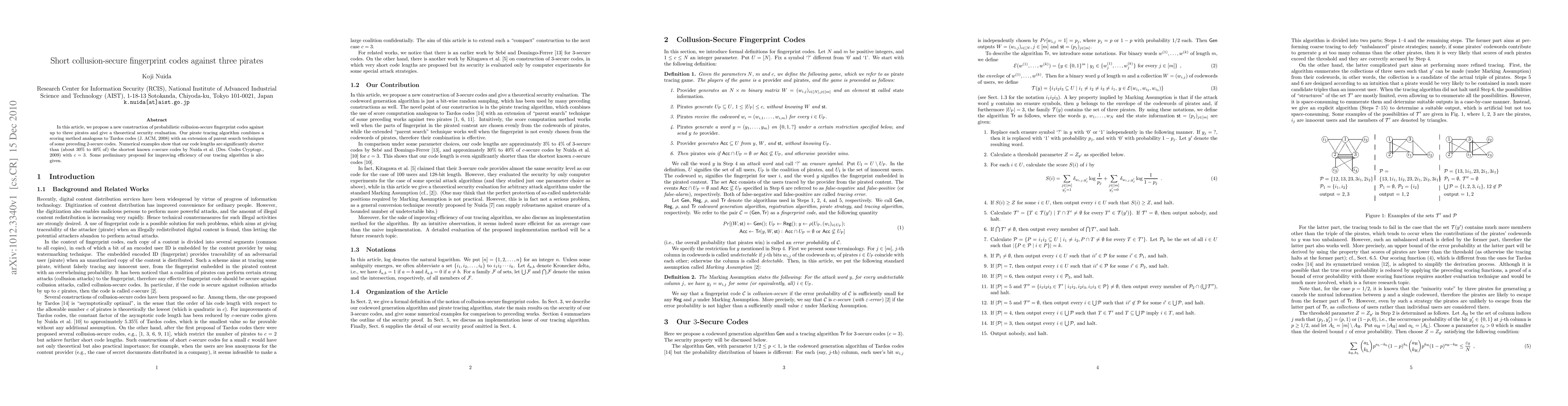This paper introduces a new probabilistic collusion-secure fingerprint code against up to three pirates, significantly shorter than existing codes, and proposes a pirate tracing algorithm combining Tardos codes and parent search techniques. The authors also suggest preliminary methods to enhance the efficiency of their tracing algorithm.