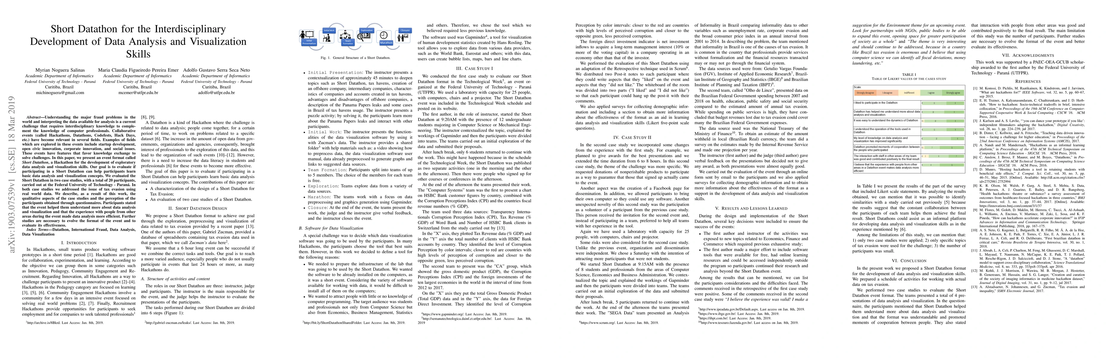 Understanding the major fraud problems in the world and interpreting the data available for analysis is a current challenge that requires interdisciplinary knowledge to complement the knowledge of computer professionals. Collaborative events (called Hackathons, Datathons, Codefests, Hack Days, etc.) have become relevant in several fields. Examples of fields which are explored in these events include startup development, open civic innovation, corporate innovation, and social issues. These events have features that favor knowledge exchange to solve challenges. In this paper, we present an event format called Short Datathon, a Hackathon for the development of exploratory data analysis and visualization skills. Our goal is to evaluate if participating in a Short Datathon can help participants learn basic data analysis and visualization concepts. We evaluated the Short Datathon in two case studies, with a total of 20 participants, carried out at the Federal University of Technology - Paran\'a. In both case studies we addressed the issue of tax evasion using real world data. We describe, as a result of this work, the qualitative aspects of the case studies and the perception of the participants obtained through questionnaires. Participants stated that the event helped them understand more about data analysis and visualization and that the experience with people from other areas during the event made data analysis more efficient. Further studies are necessary to evolve the format of the event and to evaluate its effectiveness.