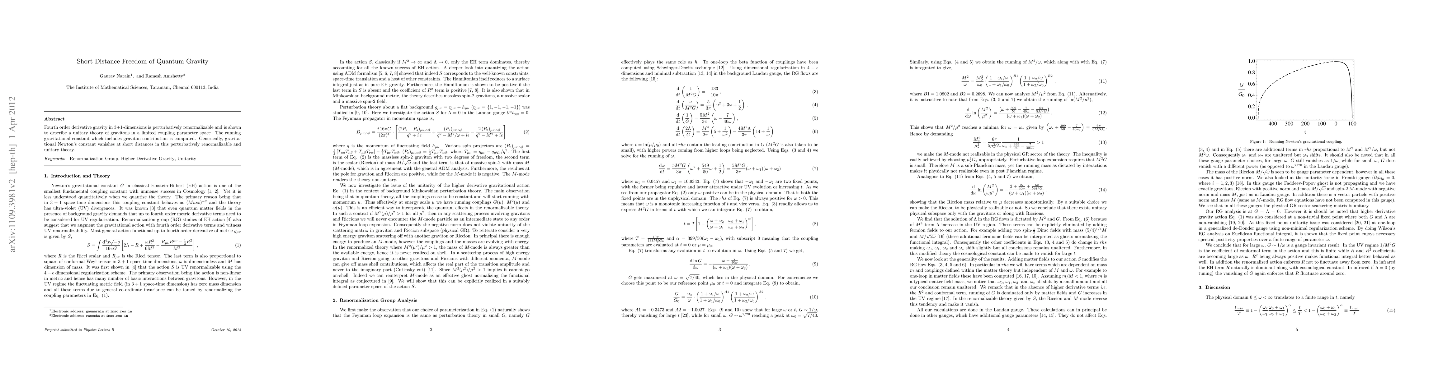 This research demonstrates that a fourth-order derivative gravity in 3+1 dimensions is renormalizable and describes a unitary graviton theory within specific coupling limits. The study computes a running gravitational constant, revealing that the gravitational Newton's constant typically becomes zero at short distances in this renormalizable and unitary model.