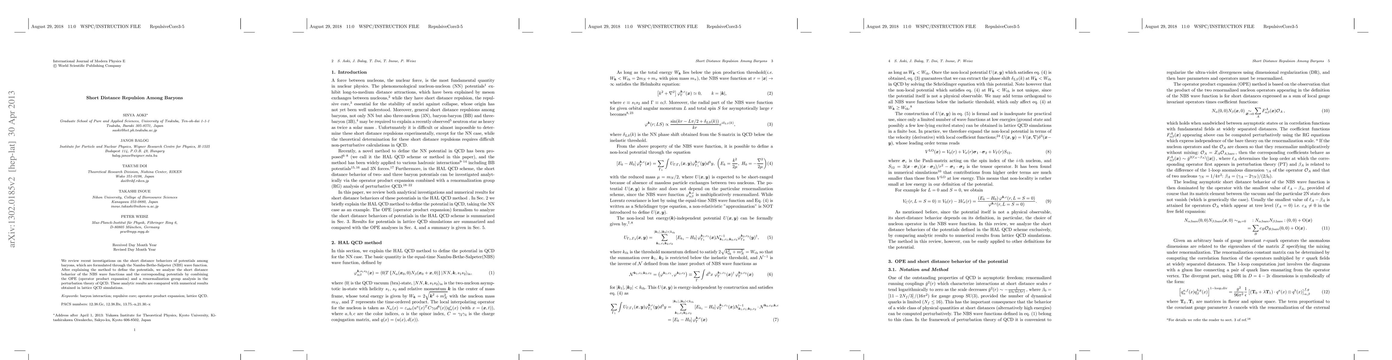 We review recent investigations on the short distance behaviors of potentials among baryons, which are formulated through the Nambu-Bethe-Salpeter (NBS) wave function. After explaining the method to define the potentials, we analyze the short distance behavior of the NBS wave functions and the corresponding potentials by combining the operator product expansion and a renormalization group analysis in the perturbation theory of QCD. These analytic results are compared with numerical results obtained in lattice QCD simulations.