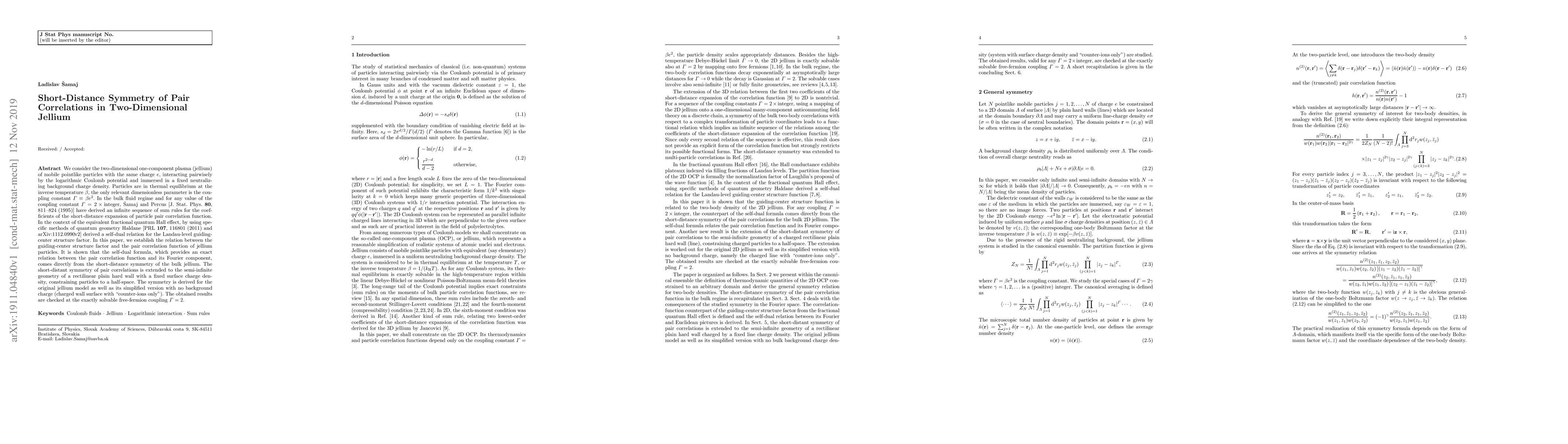 We consider the two-dimensional one-component plasma (jellium) of mobile pointlike particles with the same charge $e$, interacting pairwisely by the logarithmic Coulomb potential and immersed in a fixed neutralizing background charge density. Particles are in thermal equilibrium at the inverse temperature $\beta$, the only relevant dimensionless parameter is the coupling constant $\Gamma\equiv\beta e^2$. In the bulk fluid regime and for any value of the coupling constant $\Gamma=2\times{\rm integer}$, \v{S}amaj and Percus [J. Stat. Phys. {\bf 80}, 811--824 (1995)] have derived an infinite sequence of sum rules for the coefficients of the short-distance expansion of particle pair correlation function. In the context of the equivalent fractional quantum Hall effect, by using specific methods of quantum geometry Haldane [PRL {\bf 107}, 116801 (2011) and arXiv:1112.0990v2] derived a self-dual relation for the Landau-level guiding-center structure factor. In this paper, we establish the relation between the guiding-center structure factor and the pair correlation function of jellium particles. It is shown that the self-dual formula, which provides an exact relation between the pair correlation function and its Fourier component, comes directly from the short-distance symmetry of the bulk jellium. The short-distant symmetry of pair correlations is extended to the semi-infinite geometry of a rectilinear plain hard wall with a fixed surface charge density, constraining particles to a half-space. The symmetry is derived for the original jellium model as well as its simplified version with no background charge (charged wall surface with ``counter-ions only''). The obtained results are checked at the exactly solvable free-fermion coupling $\Gamma=2$.