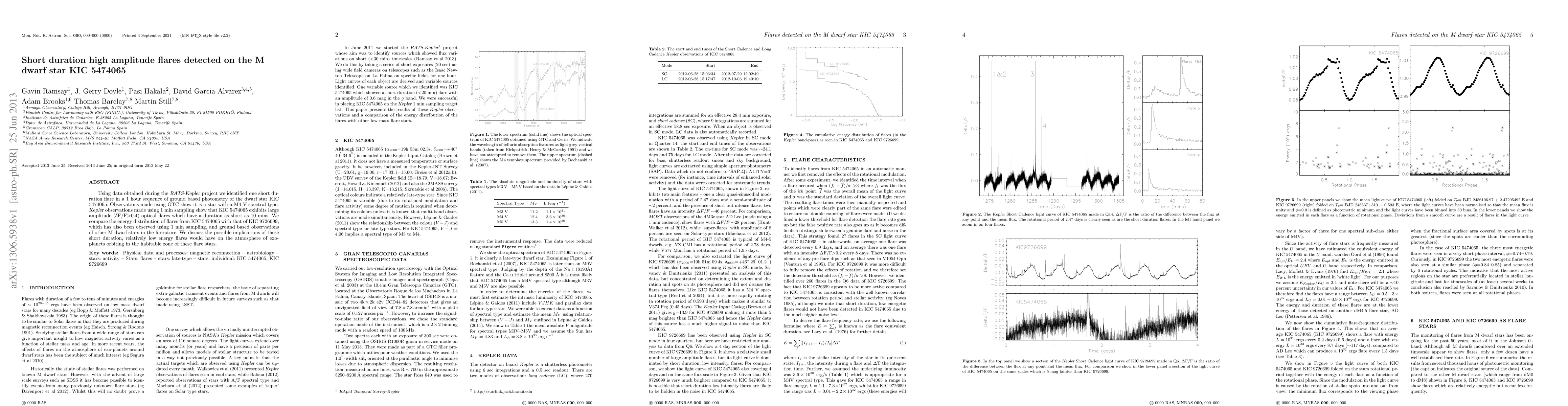 Using data obtained during the RATS-Kepler project we identified one short duration flare in a 1 hour sequence of ground based photometry of the dwarf star KIC 5474065. Observations made using GTC show it is a star with a M4 V spectral type. Kepler observations made using 1 min sampling show that KIC 5474065 exhibits large amplitude (deltaF/F>0.4) optical flares which have a duration as short as 10 mins. We compare the energy distribution of flares from KIC 5474065 with that of KIC 9726699, which has also been observed using 1 min sampling, and ground based observations of other M dwarf stars in the literature. We discuss the possible implications of these short duration, relatively low energy flares would have on the atmosphere of exo-planets orbiting in the habitable zone of these flare stars.