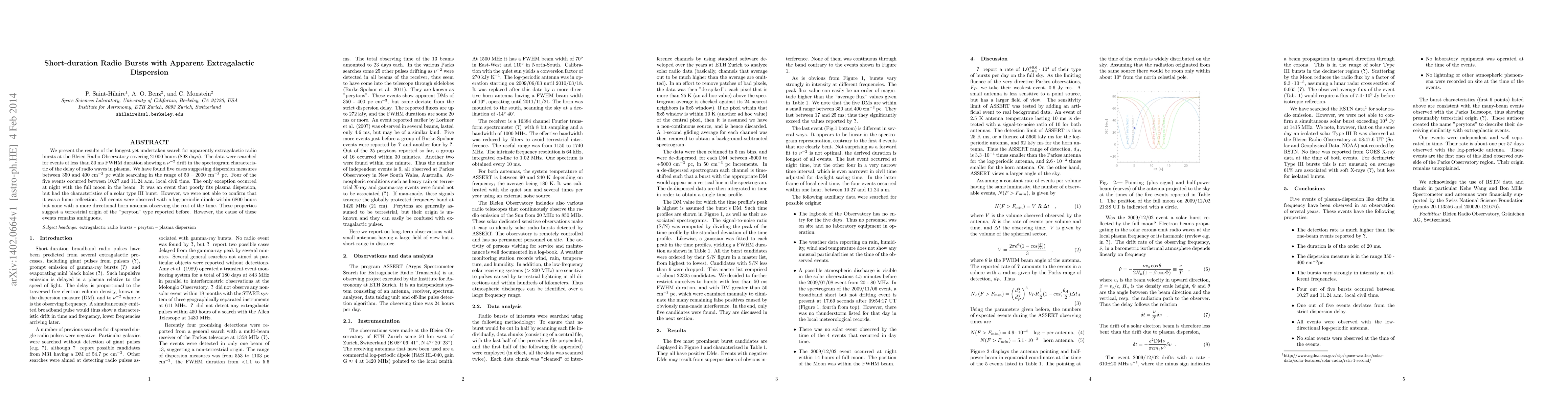 We present the results of the longest yet undertaken search for apparently extragalactic radio bursts at the Bleien Radio Observatory covering 21000 hours (898 days). The data were searched for events of less than 50 ms FWHM duration showing a $\nu^{-2}$ drift in the spectrogram characteristic of the delay of radio waves in plasma. We have found five cases suggesting dispersion measures between 350 and 400 cm$^{-3}$ pc while searching in the range of 50 -- 2000 cm$^{-3}$ pc. Four of the five events occurred between 10.27 and 11.24 a.m. local civil time. The only exception occurred at night with the full moon in the beam. It was an event that poorly fits plasma dispersion, but had the characteristics of a solar type III burst. However, we were not able to confirm that it was a lunar reflection. All events were observed with a log-periodic dipole within 6800 hours but none with a more directional horn antenna observing the rest of the time. These properties suggest a terrestrial origin of the "peryton" type reported before. However, the cause of these events remains ambiguous.