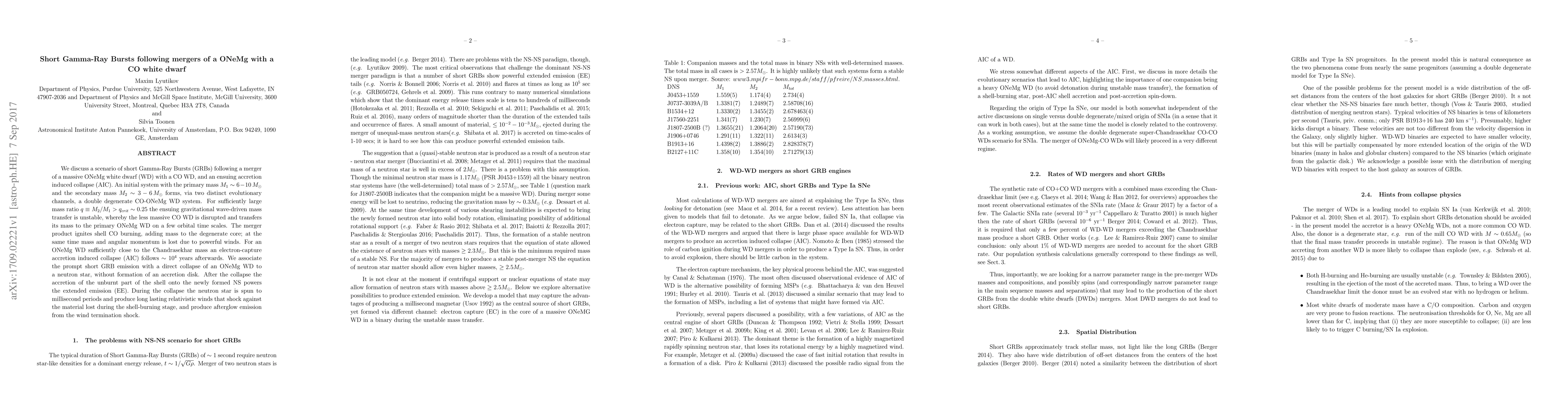 We discuss a scenario of short Gamma-Ray Bursts (GRBs) following a merger of a massive ONeMg white dwarf (WD) with a CO WD, and an ensuing accretion induced collapse (AIC). An initial system with the primary mass $M_1 \sim 6-10 \, M_\odot$ and the secondary mass $M_2 \sim 3-6\, M_\odot$ forms, via two distinct evolutionary channels, a double degenerate CO-ONeMg WD system. For sufficiently large mass ratio $q \equiv M_2/M_1 > q_{crit} \sim 0.25$ the ensuing gravitational wave-driven mass transfer is unstable, whereby the less massive CO WD is disrupted and transfers its mass to the primary ONeMg WD on a few orbital time scales. The merger product ignites shell CO burning, adding mass to the degenerate core; at the same time mass and angular momentum is lost due to powerful winds. For an ONeMg WD sufficiently close to the Chandrasekhar mass an electron-capture accretion induced collapse (AIC) follows $\sim 10^4$ years afterwards. We associate the prompt short GRB emission with a direct collapse of an ONeMg WD to a neutron star, without formation of an accretion disk. After the collapse the accretion of the unburnt part of the shell onto the newly formed NS powers the extended emission (EE). During the collapse the neutron star is spun to millisecond periods and produce long lasting relativistic winds that shock against the material lost during the shell-burning stage, and produce afterglow emission from the wind termination shock.