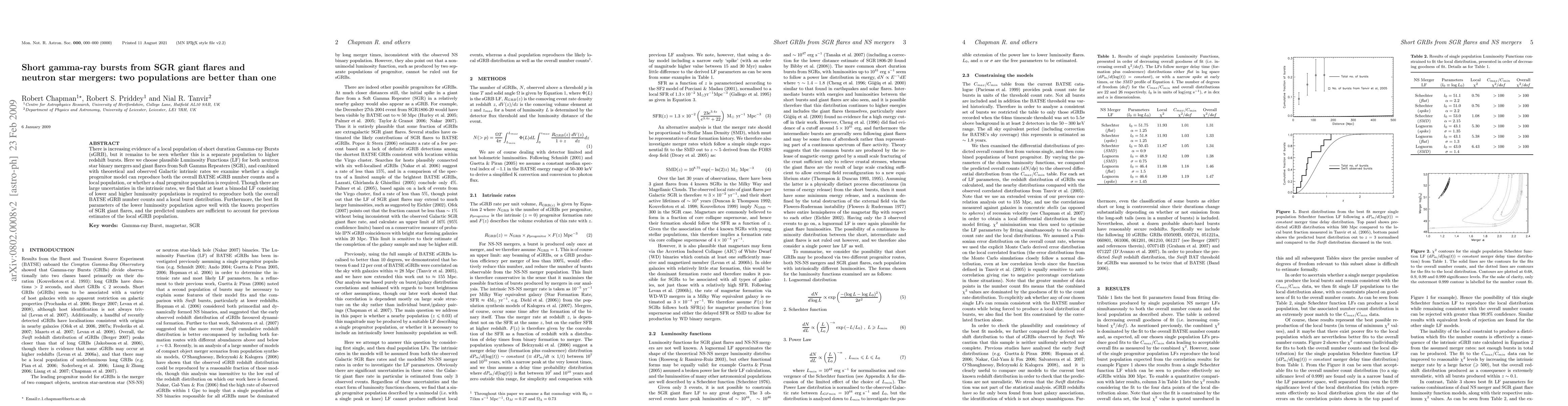 There is increasing evidence of a local population of short duration Gamma-ray Bursts (sGRB), but it remains to be seen whether this is a separate population to higher redshift bursts. Here we choose plausible Luminosity Functions (LF) for both neutron star binary mergers and giant flares from Soft Gamma Repeaters (SGR), and combined with theoretical and observed Galactic intrinsic rates we examine whether a single progenitor model can reproduce both the overall BATSE sGRB number counts and a local population, or whether a dual progenitor population is required. Though there are large uncertainties in the intrinsic rates, we find that at least a bimodal LF consisting of lower and higher luminosity populations is required to reproduce both the overall BATSE sGRB number counts and a local burst distribution. Furthermore, the best fit parameters of the lower luminosity population agree well with the known properties of SGR giant flares, and the predicted numbers are sufficient to account for previous estimates of the local sGRB population.