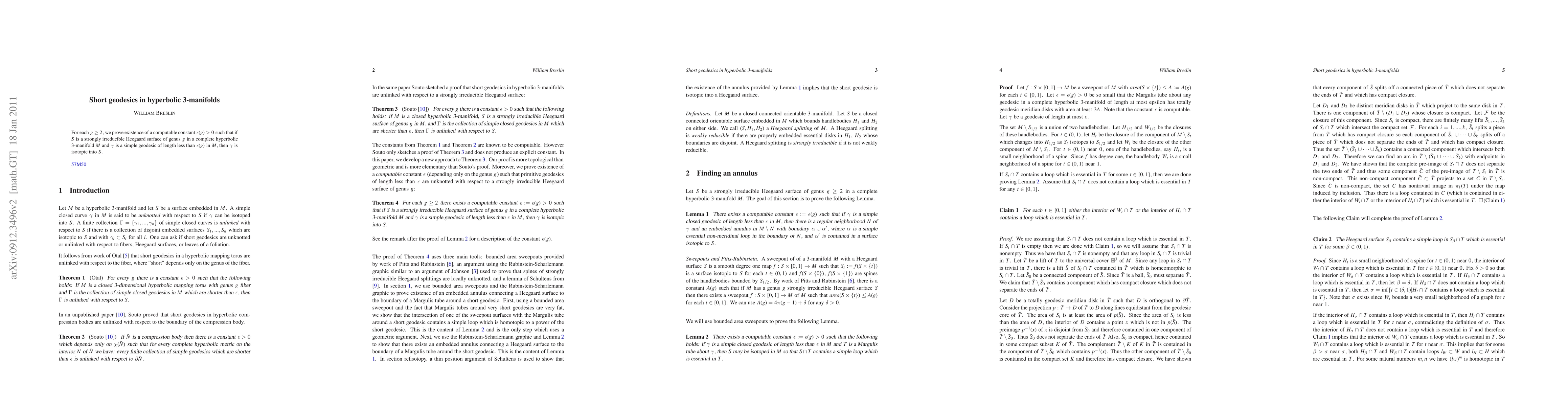 A new theorem in hyperbolic geometry shows that a simple geodesic of short length can always be isotoped into a strongly irreducible Heegaard surface within the 3-manifold, proving its existence for every complete hyperbolic manifold with genus g >= 2.