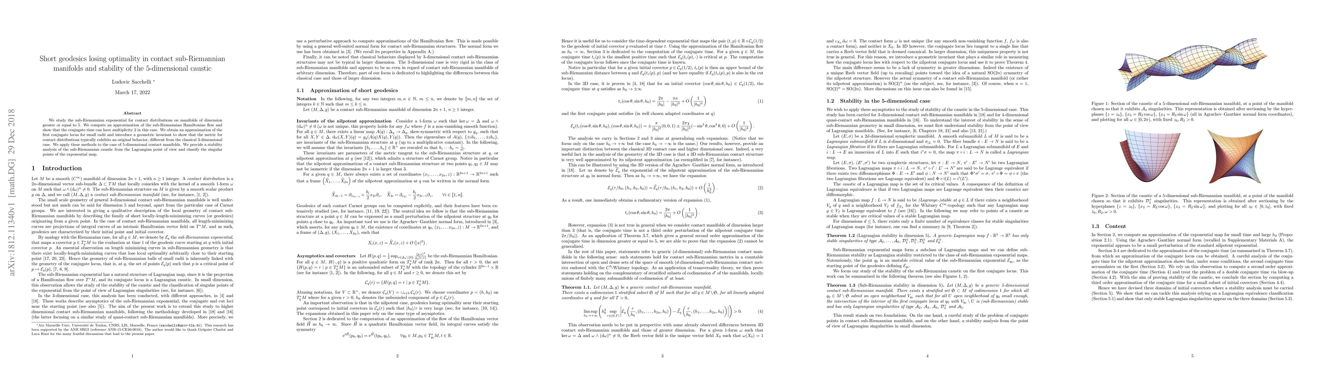 We study the sub-Riemannian exponential for contact distributions on manifolds of dimension greater or equal to 5. We compute an approximation of the sub-Riemannian Hamiltonian flow and show that the conjugate time can have multiplicity 2 in this case. We obtain an approximation of the first conjugate locus for small radii and introduce a geometric invariant to show that the metric for contact distributions typically exhibits an original behavior, different from the classical 3-dimensional case. We apply these methods to the case of 5-dimensional contact manifolds. We provide a stability analysis of the sub-Riemannian caustic from the Lagrangian point of view and classify the singular points of the exponential map.