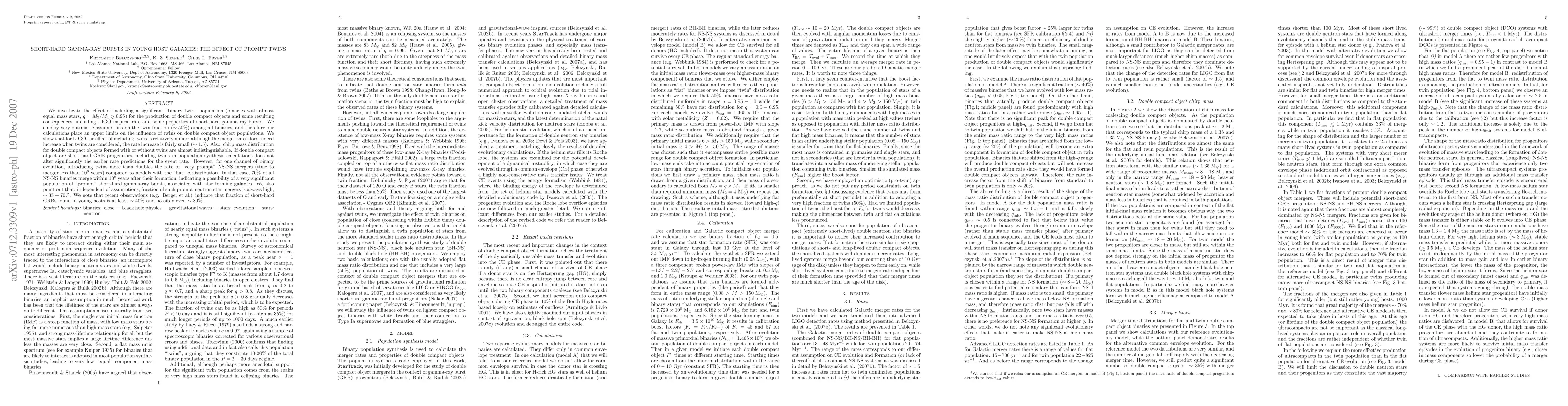 This paper explores the impact of including a significant population of "binary twin" systems on the formation of double compact objects and the properties of short-hard gamma-ray bursts (GRBs). The inclusion of twins slightly increases merger rates and does not significantly alter earlier GRB rate predictions, but notably doubles the rate of "very prompt" neutron star mergers, suggesting a substantial population of "prompt" short-hard GRBs in star-forming galaxies.