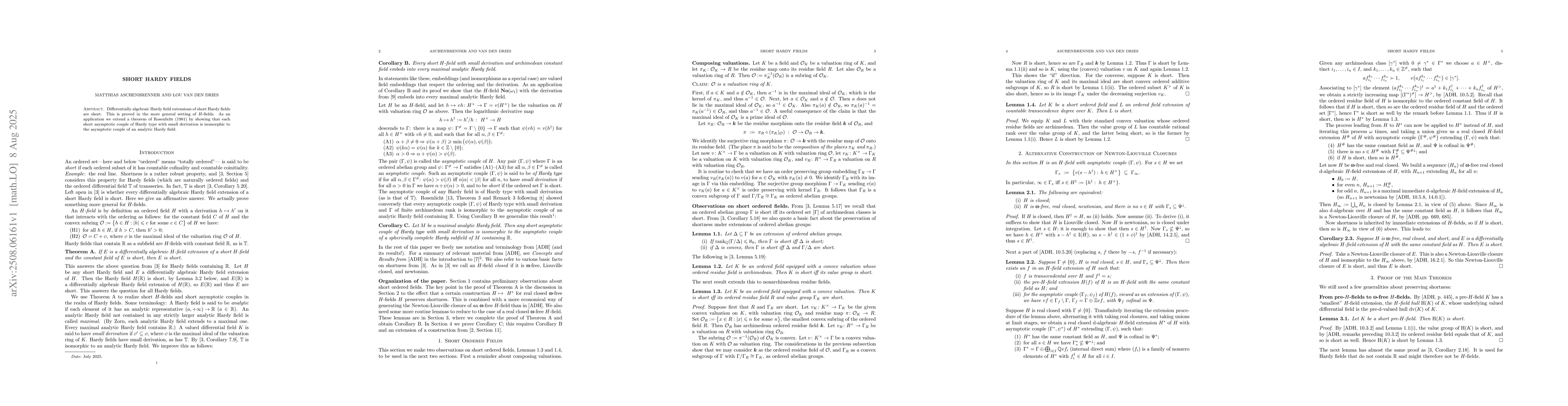 Differentially algebraic Hardy field extensions of short Hardy fields are short. This is proved in the more general setting of $H$-fields. As an application we extend a theorem of Rosenlicht (1981) by showing that each short asymptotic couple of Hardy type with small derivation is isomorphic to the asymptotic couple of an analytic Hardy field.