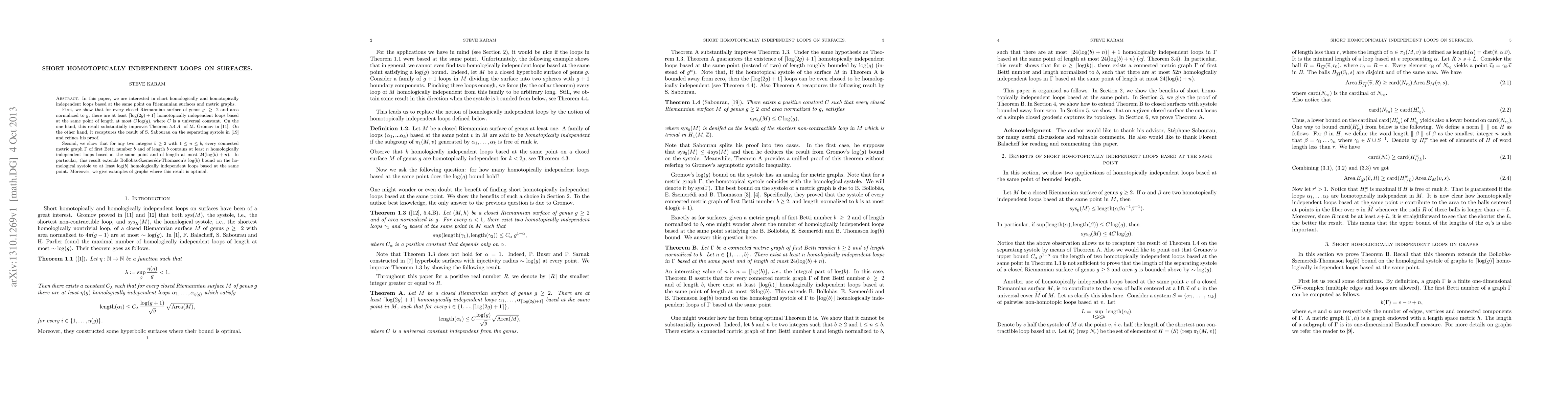In this paper, we are interested in short homologically and homotopically independent loops based at the same point on Riemannian surfaces and metric graphs. First, we show that for every closed Riemannian surface of genus $g \geq 2$ and area normalized to $g$, there are at least $\ceil{\log(2g)+1}$ homotopically independent loops based at the same point of length at most $C\log(g)$, where $C$ is a universal constant. On the one hand, this result substantially improves Theorem $5.4.A$ of M. Gromov in \cite{G1}. On the other hand, it recaptures the result of S. Sabourau on the separating systole in \cite{SS} and refines his proof. Second, we show that for any two integers $b\geq 2$ with $1\leq n\leq b$, every connected metric graph $\Gamma$ of first Betti number $b$ and of length $b$ contains at least $n$ homologically independent loops based at the same point and of length at most $24(\log(b)+n)$. In particular, this result extends Bollob\`as-Szemer\'edi-Thomason's $\log(b)$ bound on the homological systole to at least $\log(b)$ homologically independent loops based at the same point. Moreover, we give examples of graphs where this result is optimal.