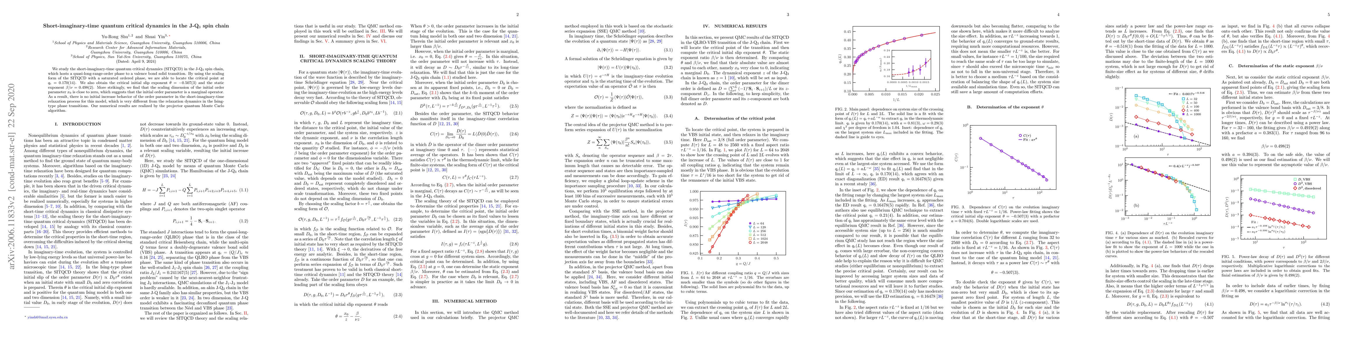 This paper investigates the short-imaginary-time quantum critical dynamics in the J-Q$_3$ spin chain, identifying the critical point and obtaining exponents. It finds that the initial order parameter is a marginal operator, leading to a unique relaxation behavior distinct from Ising-type transitions. Numerical results are derived using the projector quantum Monte Carlo algorithm.