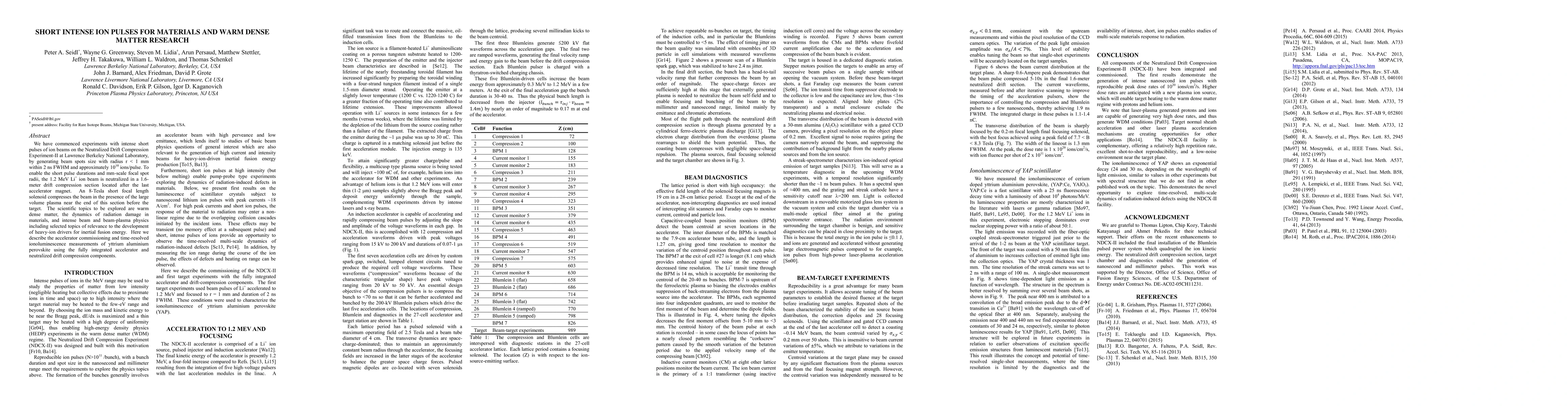 This paper reports on experiments using intense, short ion pulses with a radius of less than 1 mm and 10^10 ions/pulse to study warm dense matter and radiation damage in materials. The ion beam is neutralized and compressed using a drift compression section and an 8-Tesla solenoid.
