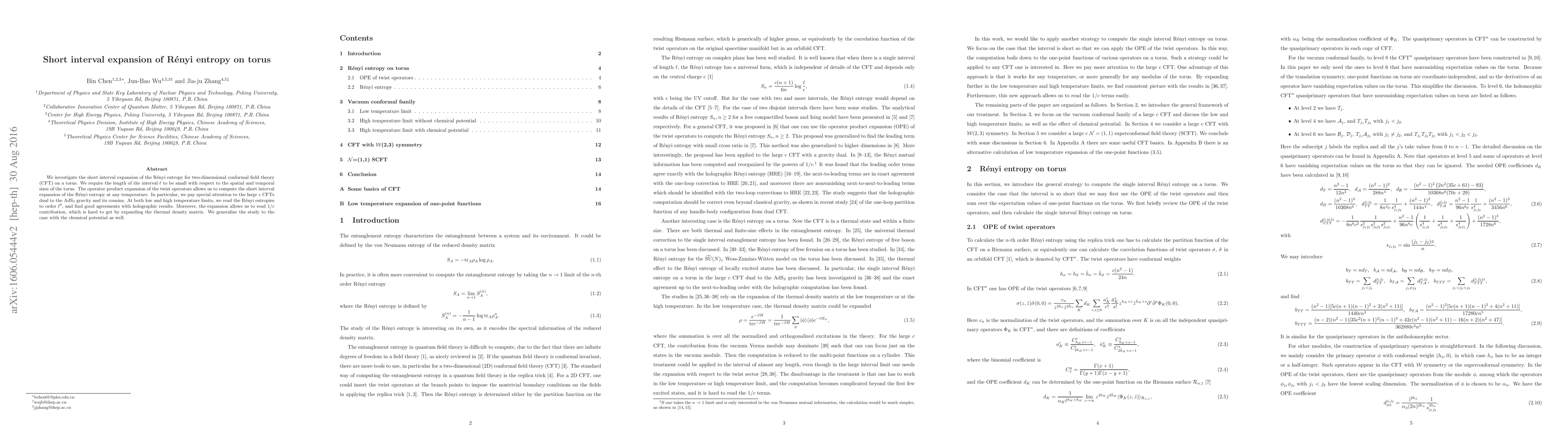 This paper investigates the short interval expansion of Rényi entropy in 2D CFT on a torus, focusing on low and high temperature limits and large $c$ CFTs dual to AdS$_3$ gravity. The study achieves order $\ell^6$ agreement with holographic results and reveals $1/c$ contributions, extending the analysis to include chemical potentials.